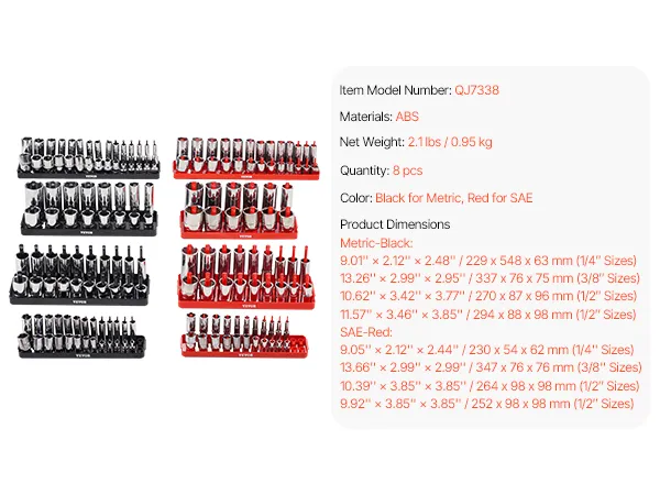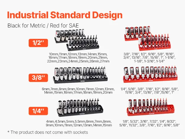 High Compatibility: Designed to be compatible with multiple socket brands, VEVOR 8PCS socket organizer set holds up to 176pcs metric and SAE standard & deep sockets., simplifying sockets management, keeping the workspace clean and ensuring you won't lose any sockets. Note: Sockets are not included.