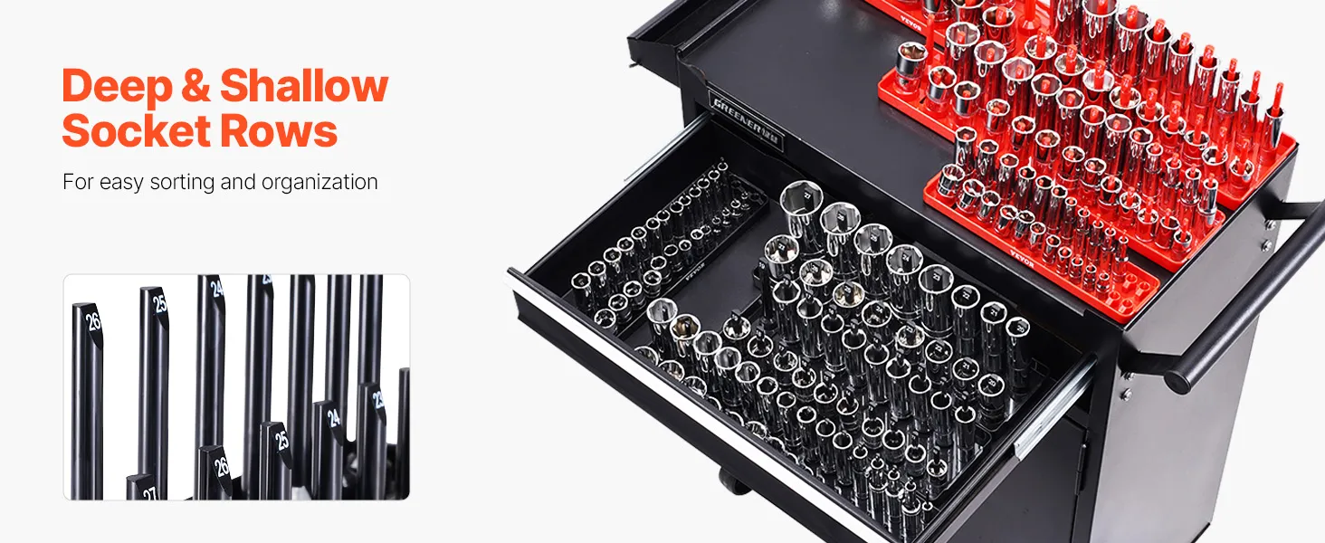 VEVOR high-rod socket organizer set holds up to 176 sockets and is compatible with various brands, making storage efficient and neat. The deep/shallow-rod design allows easy sorting by size. This socket holder ensures quick access and organized management, ideal for pros and home use.
