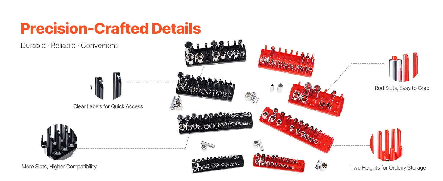 Neat Storage: The high-rod socket tray organizes sockets orderly to avoid loss and can hold up to 176 sockets. You can easily locate what you need, which enhances work efficiency.