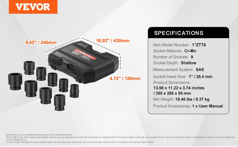 VEVOR Axle Nut Impact Socket Set 1" Drive 6-Point 9-Piece