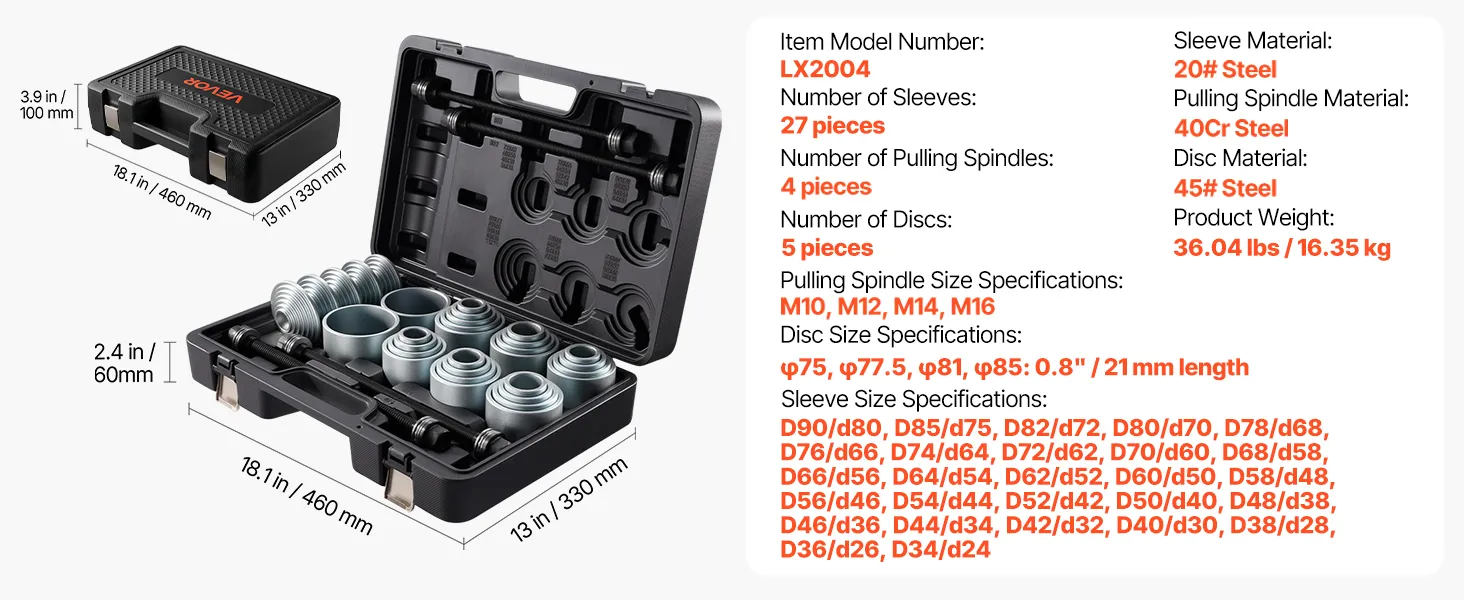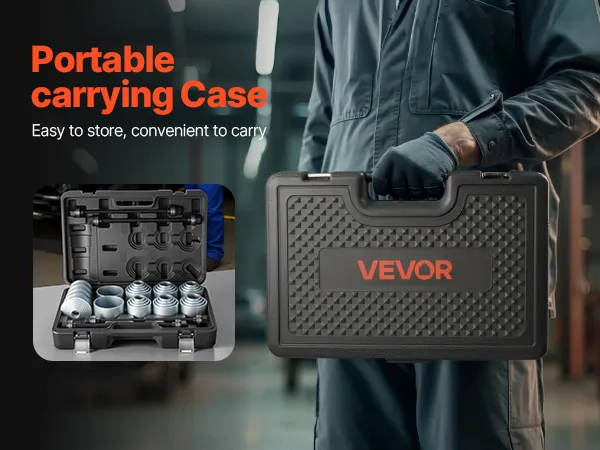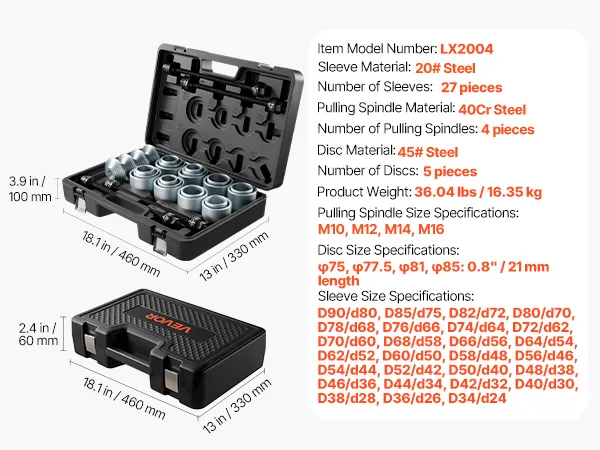 27 Sizes Available: The bushing removal kit includes 27 different sleeve sizes to meet various repair needs. Its user-friendly design focuses on easy operation, helping users complete bushing removal and installation tasks efficiently and precisely