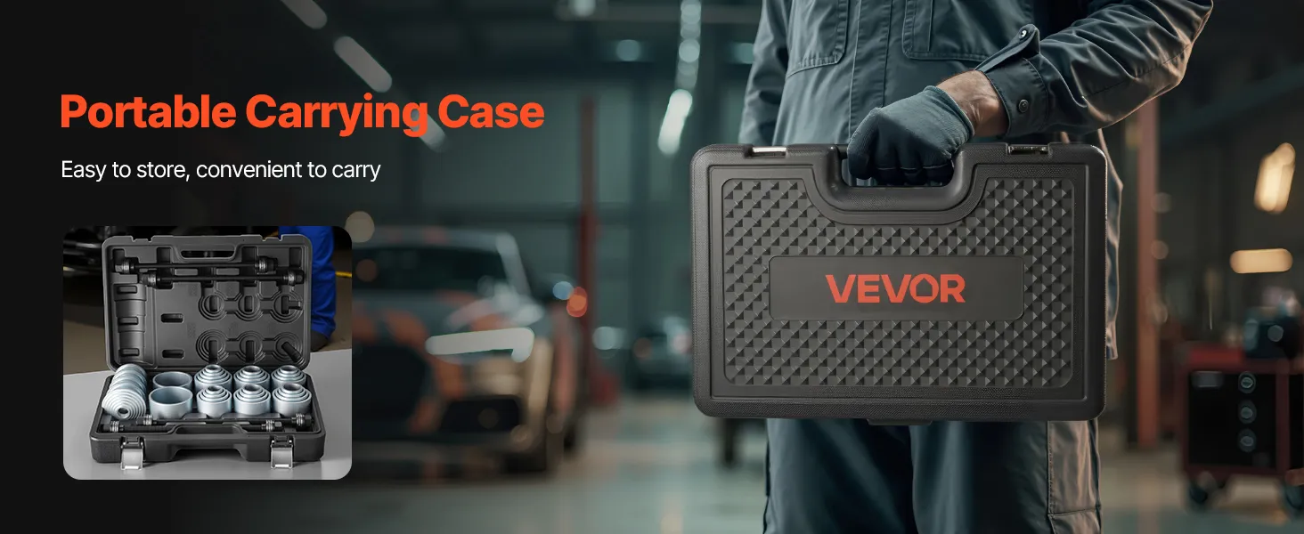 The lightweight carrying case for the press sleeve kit keeps all tools organized and easily accessible. Its compact design makes transport and daily storage simple—ideal for workshops, garages, or on-the-go repairs.