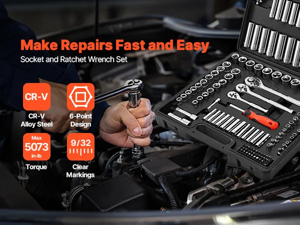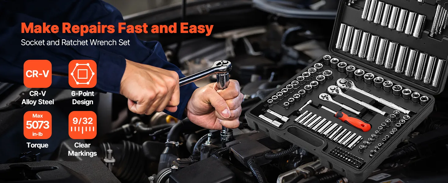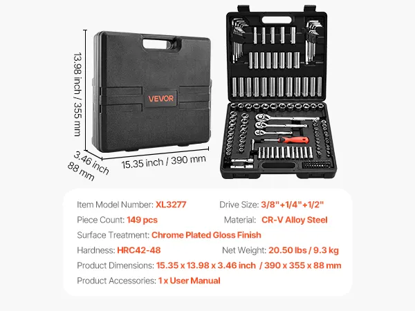 VEVOR Socket Set, 149 Pieces, 9.5 & 6.4 & 12.7 mm Drive Socket and Ratchet Set, SAE and Metric, Deep and Shallow, Mechanic Tool Kit with Bits, Accessories, Storage Case, CR-V Alloy Steel, for Repair