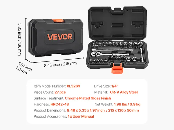 VEVOR Socket Set, 27 Pieces, 6.4 mm Drive Socket and Ratchet Set, SAE and Metric, Mechanic Tool Kit with Ratchet Wrench, Extension Bar and Storage Case, CR-V Alloy Steel, for Automotive Repair