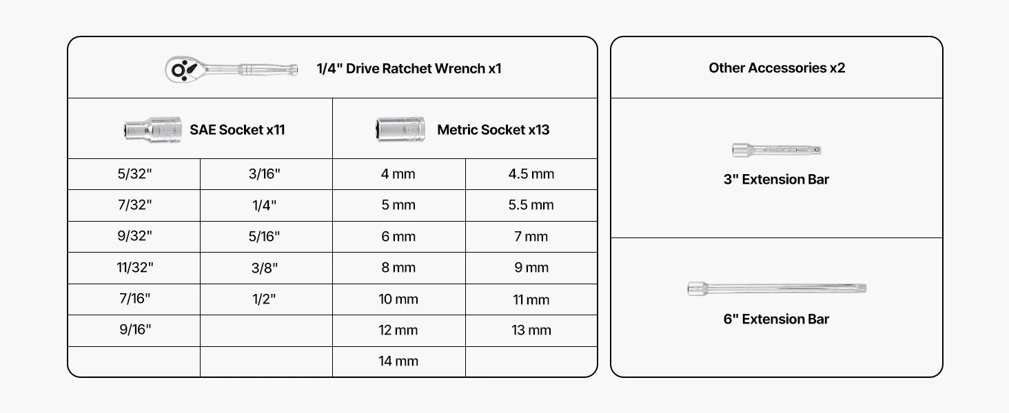 Each socket features engraved, easy-to-read size markings that are highly wear-resistant. This socket tool set ensures quick identification and faster access to the right tool when you need it.