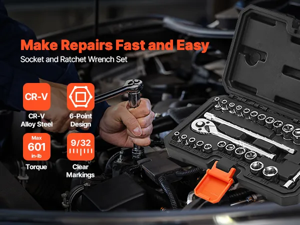 High Torque Design: Designed with a 6-point configuration, this socket and ratchet set evenly distributes pressure on fasteners to minimize wear. Its high-torque capability delivers up to 601 IN-LB, easily handling rusted or tightly secured bolts