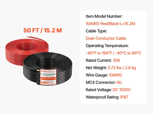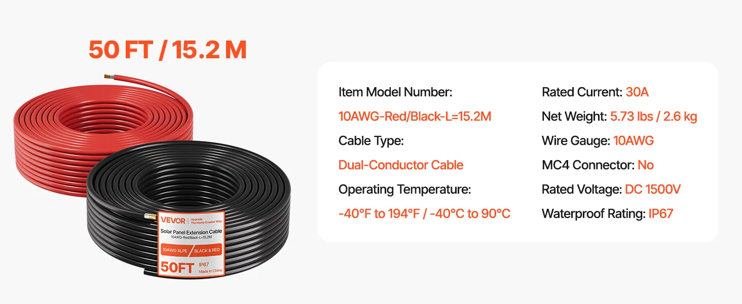 Reliable 10AWG Cable: Tested to TÜV standard, this solar panel cable meets international security standards. It is ideal for high-power solar systems, with a 50 ft (15.24 m) length for flexible DIY installations