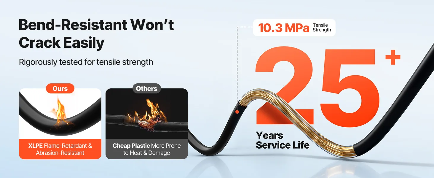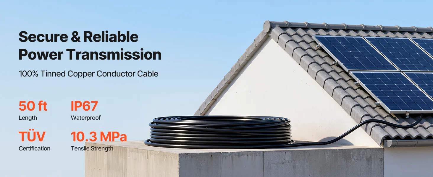 Built with 100% tinned copper and 10 AWG wire, this extension cable supports high current for secure, stable power transfer. The 50 ft length allows flexible layouts. With an IP67 dustproof and waterproof rating, XLPE insulation, and tested to TÜV standard, it is built to last for outdoor use.