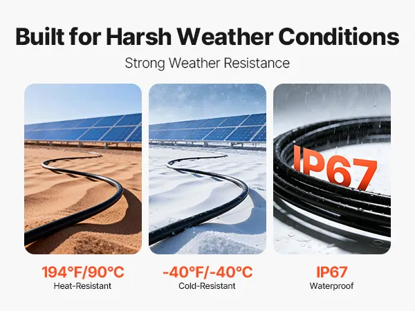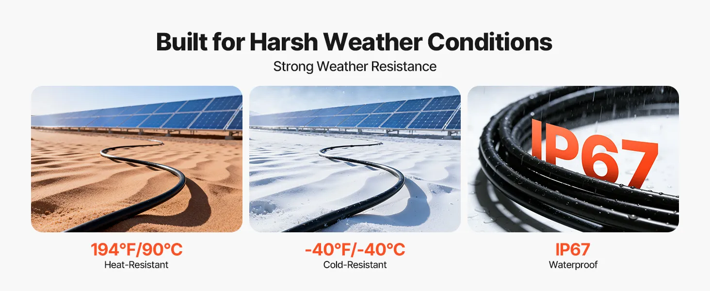 Extreme Weather Ready: Designed to operate from -40°F to 194°F, this solar panel extension cable maintains stable performance from freezing winters to scorching summers. It enables continuous and reliable power for your solar system year-round