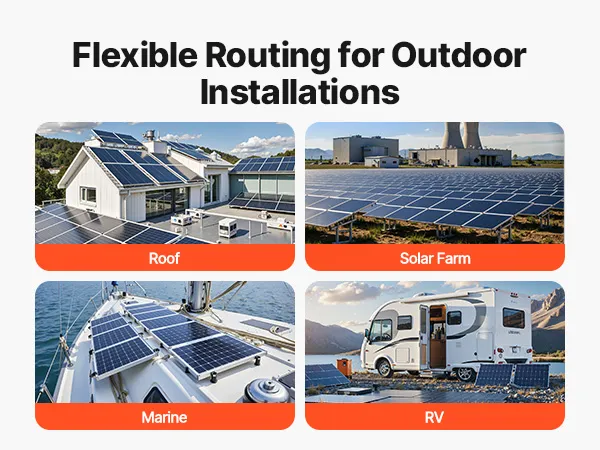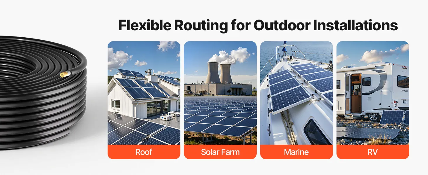 Excellent Conductivity: This solar panel extension cable uses a 100% tinned copper conductor to deliver high efficiency and low resistance power transfer. It reduces energy loss and ensures stable performance even in harsh outdoor environments