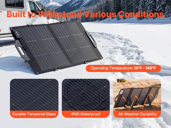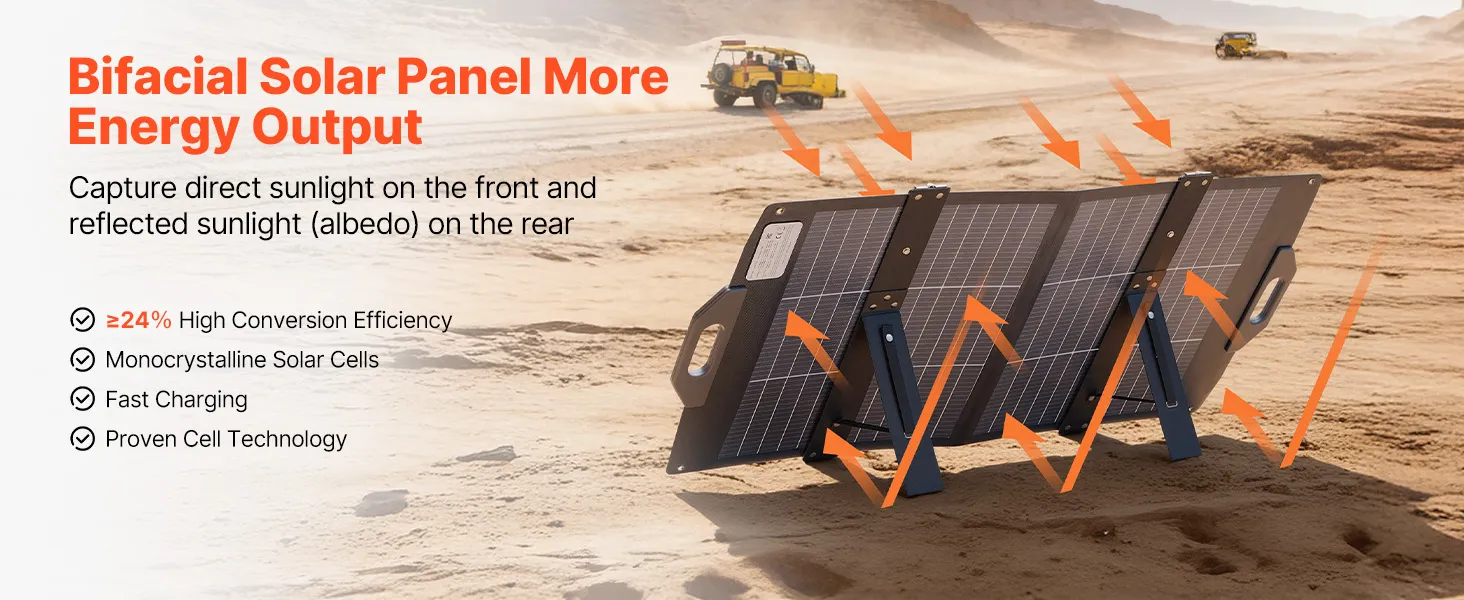 Foldable & Portable: VEVOR bifacial solar panel easily folds down into a compact size, making it easy to store and carry anywhere. Perfect for outdoor camping, RV trips, hiking, and emergency use, letting you enjoy solar power on the go