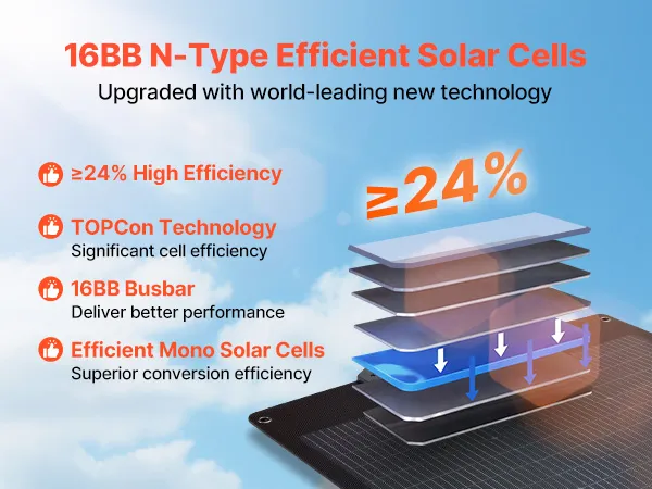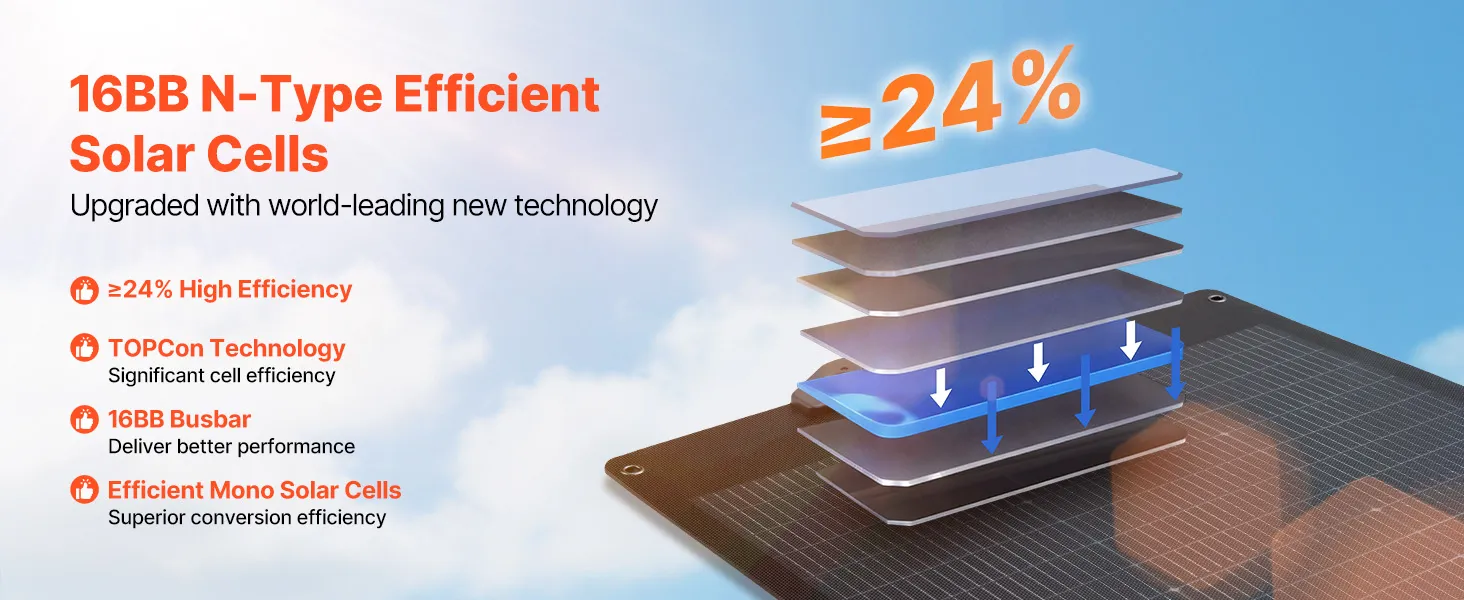 Featuring 16BB N-Type high-efficiency monocrystalline solar cells and ≥24% conversion efficiency, this solar panel captures more sunlight and ensures steady, consistent energy output to keep your devices powered.