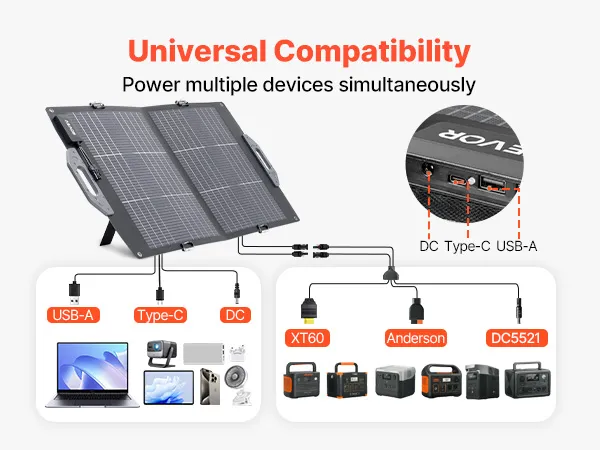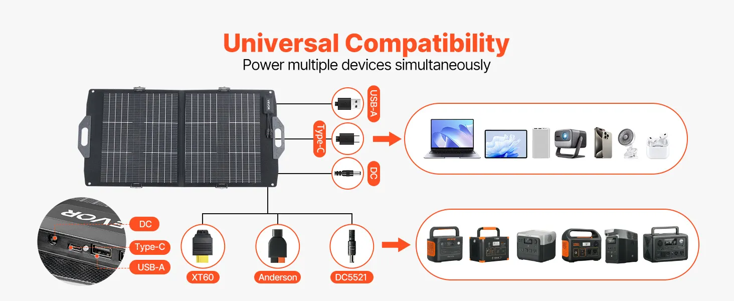 Multi-Device Charging: Includes 2 USB-A (QC 3.0), 1 Type-C, and 1 DC port to charge phones and tablets simultaneously. Also features built-in MC4 cable, a 3-in-1 MC4 connector cable (MC4 to XT60 / Anderson / DC5521) and a 10-in-1 DC connector adapter, compatible with most power stations