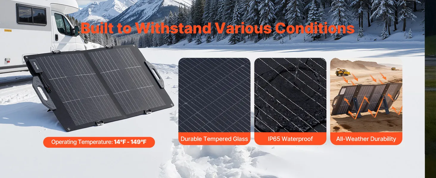 Enhanced Durability: With IP65 protection rating, this high-efficiency monocrystalline silicon solar panel charger maintains consistent performance and long-lasting durability from 14°F to 149°F, ensuring a steady power supply in various environments