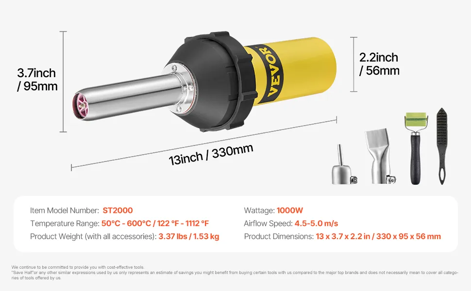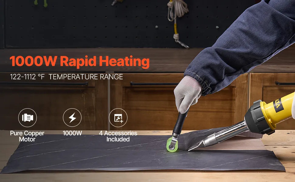 VEVOR hot air plastic welder features a 1000W powerful pure copper motor, delivering fast heating for efficient welding. It includes 2 nozzles, a seam roller, and a wire brush. With 9-level temp control, efficient cooling, and a longer power cord, it is ideal for beginners and pros.