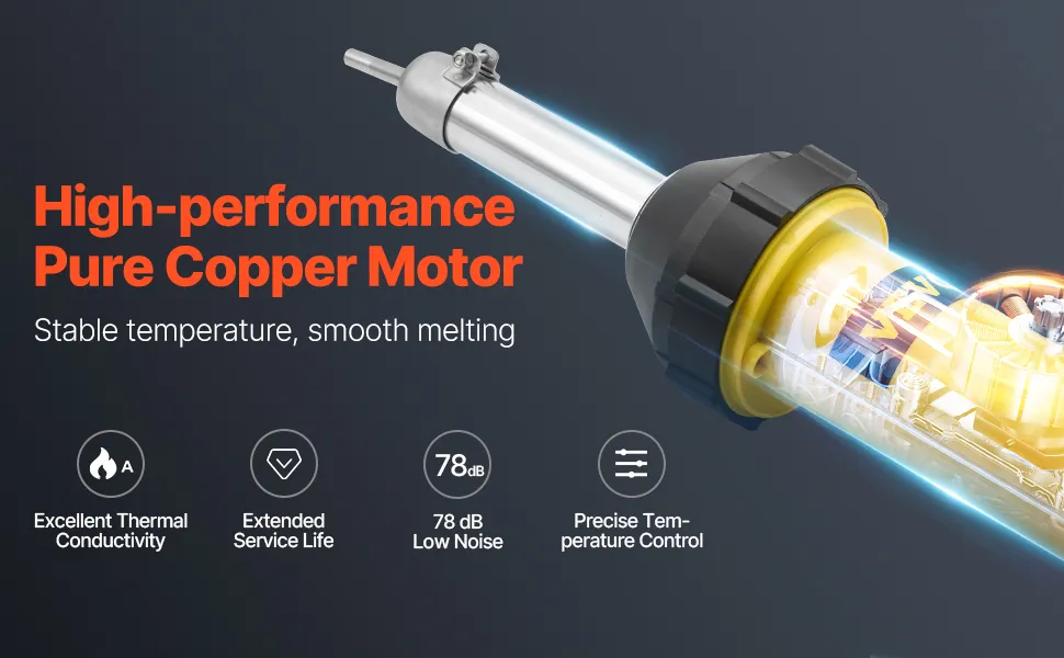 VEVOR welder features a high-performance pure copper motor for stable temperatures and excellent thermal conductivity. With precise temperature control, the melting process is smoother. The motor extends its lifespan and includes 78dB low-noise technology for an enhanced welding experience.