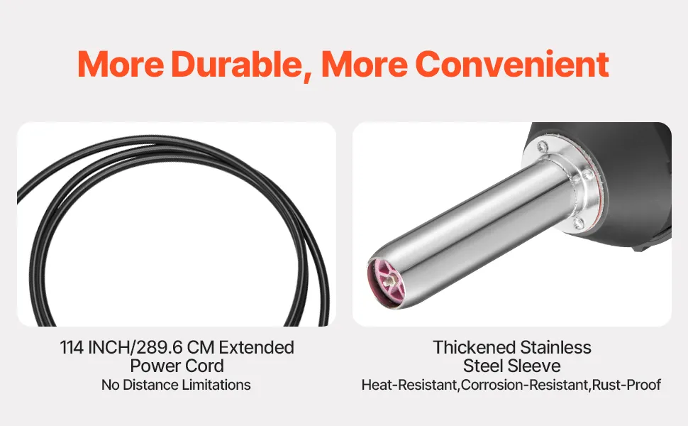 VEVOR plastic hot air welder heating gun offers 2 nozzle sizes—perfect for both precise PVC pipe welding and large-scale jobs like tarp repairs. Easily switch between the nozzles to tackle whatever task comes your way.