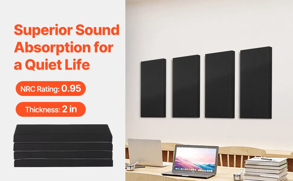 • High-Efficiency Sound Absorption: The fiberglass soundproof panels is made with 100% white fiberglass liner, 2-inch/5 cm thickness, with an NRC value of up to 0.95, effectively absorbing mid-to-high frequency noise, reducing echoes and reverberation, and creating a quiet and comfortable environment for you