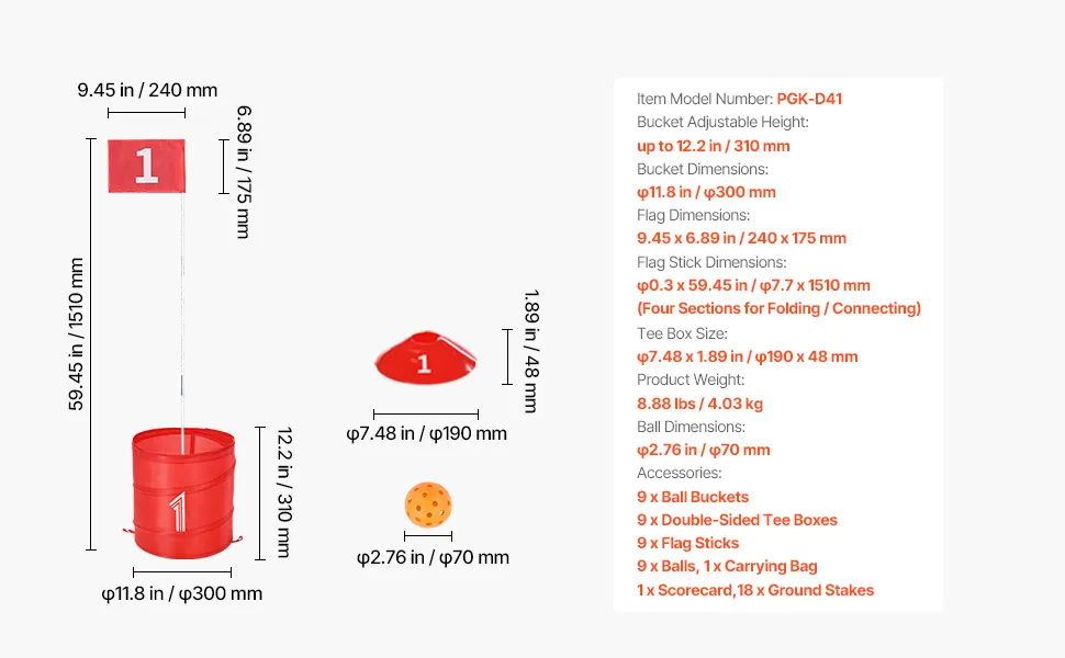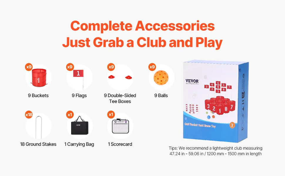 The bucket golf package includes 9 holes, 18 ground stakes, 9 flags, 9 double-sided tee boxes, 9 balls, 1 carrying bag, and 1 scorecard, providing everything you need for a complete game experience. A lightweight club of 47.24 in - 59.06 in is recommended to enhance your play.