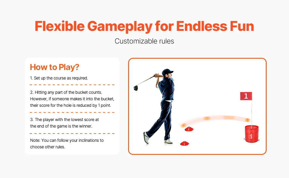 Follow the suggested gameplay or create your own rules. Adjust the tee boxes and holes as needed. Hitting any part of the bucket counts. Innovative rules make the lowest score wins. The golf game with buckets is great for family gatherings and friends, ensuring interactive fun anytime.