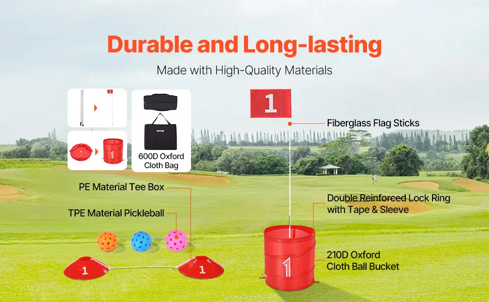 High-Quality Materials: Our golf game with buckets features TPE pickleballs, Oxford cloth buckets, reinforced lock rings with tape and sleeves, fiberglass flag sticks, and corrosion-resistant PE tee boxes. These durable materials ensure long-lasting enjoyment.