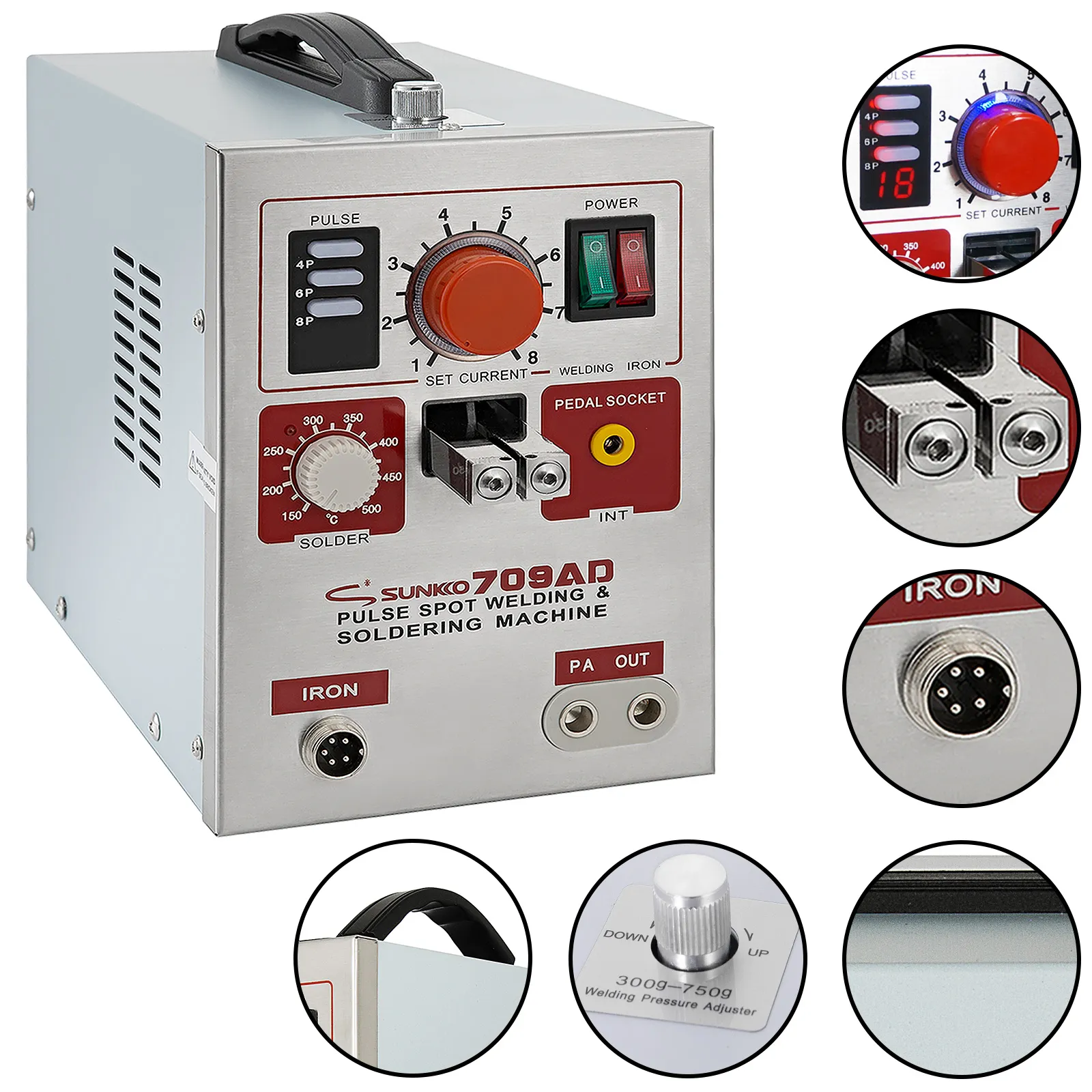 【ADJUSTABLE PULSE & CURRENT】- Under spot welding, the pulse energy output is optional: 2P, 4P, 6P, 8P, 10P, 14P, 16P, 18P for a wider range of welding materials. The stepless welding current adjustment ranges from 50 to 800 Amps. Welding pressure adjuster (range: 300-750g) on top is designed for different thickness workpieces.