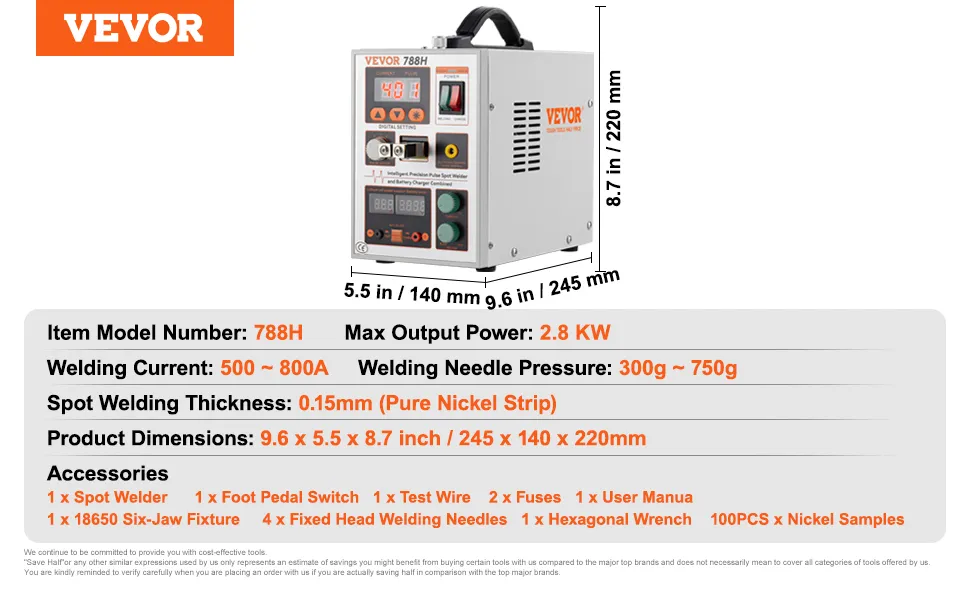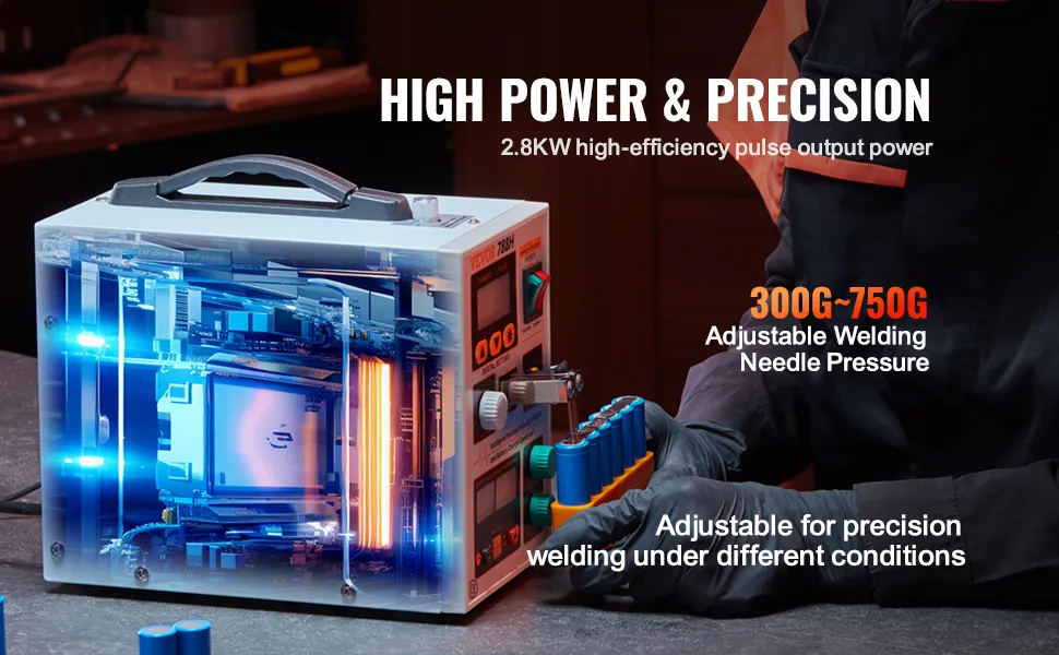 Introducing VEVOR 788H battery pulse spot welder & battery charger – your ultimate solution for enhanced welding efficiency. With 2.8KW pulse output power and 300g-750g adjustable welding needle pressure, it achieves superior spot welding results for battery pack, pure nickel, and plated nickel.