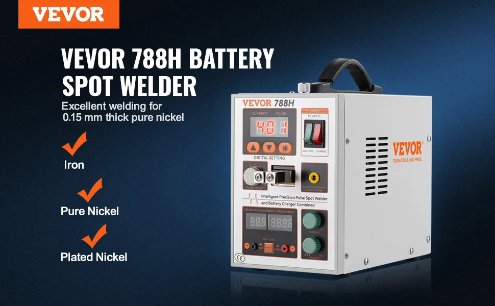 Enhanced Welding Strength: VEVOR 788H battery pulse spot welder facilitates precise welding for 0.15mm pure nickel stripes, perfect for building rechargeable lithium battery packs like 18650 and 14500, as well as handling pure nickel, nickel-plated, and iron materials for various industrial applications.