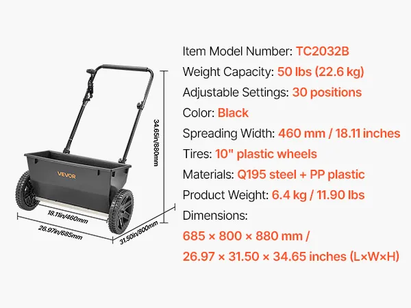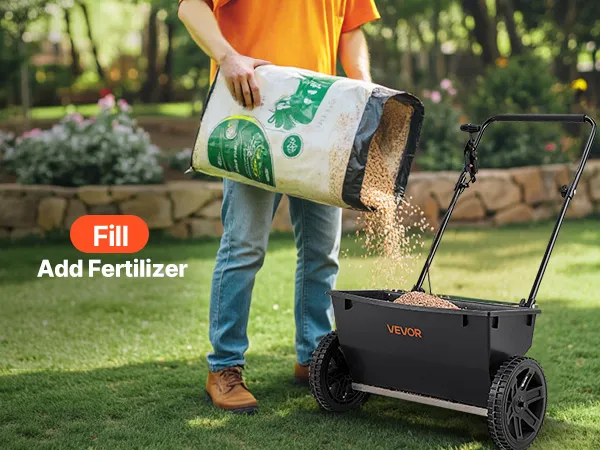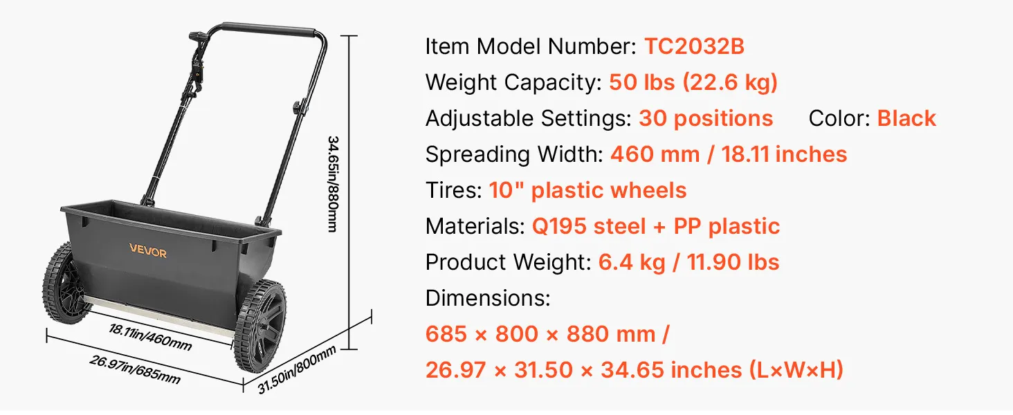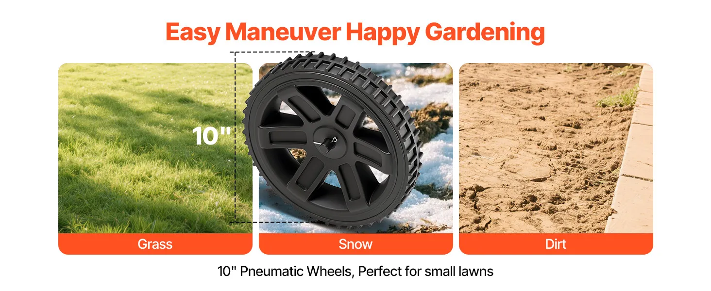 Durable Construction: Featuring a powder-coated steel frame and explosion-proof plastic wheels, the lawn spreader is resistant to UV corrosion and impact. Equipped with 10-inch pneumatic wheels, it’s suitable for grass, gravel, and snow-covered terrain.