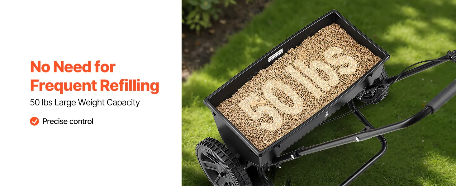 Easy Installation: No tools required for assembly. It is simple for women or seniors to assemble the fertilizer spreader. The 50lb large-capacity hopper reduces refilling frequency, saving time and effort for a more focused gardening experience.