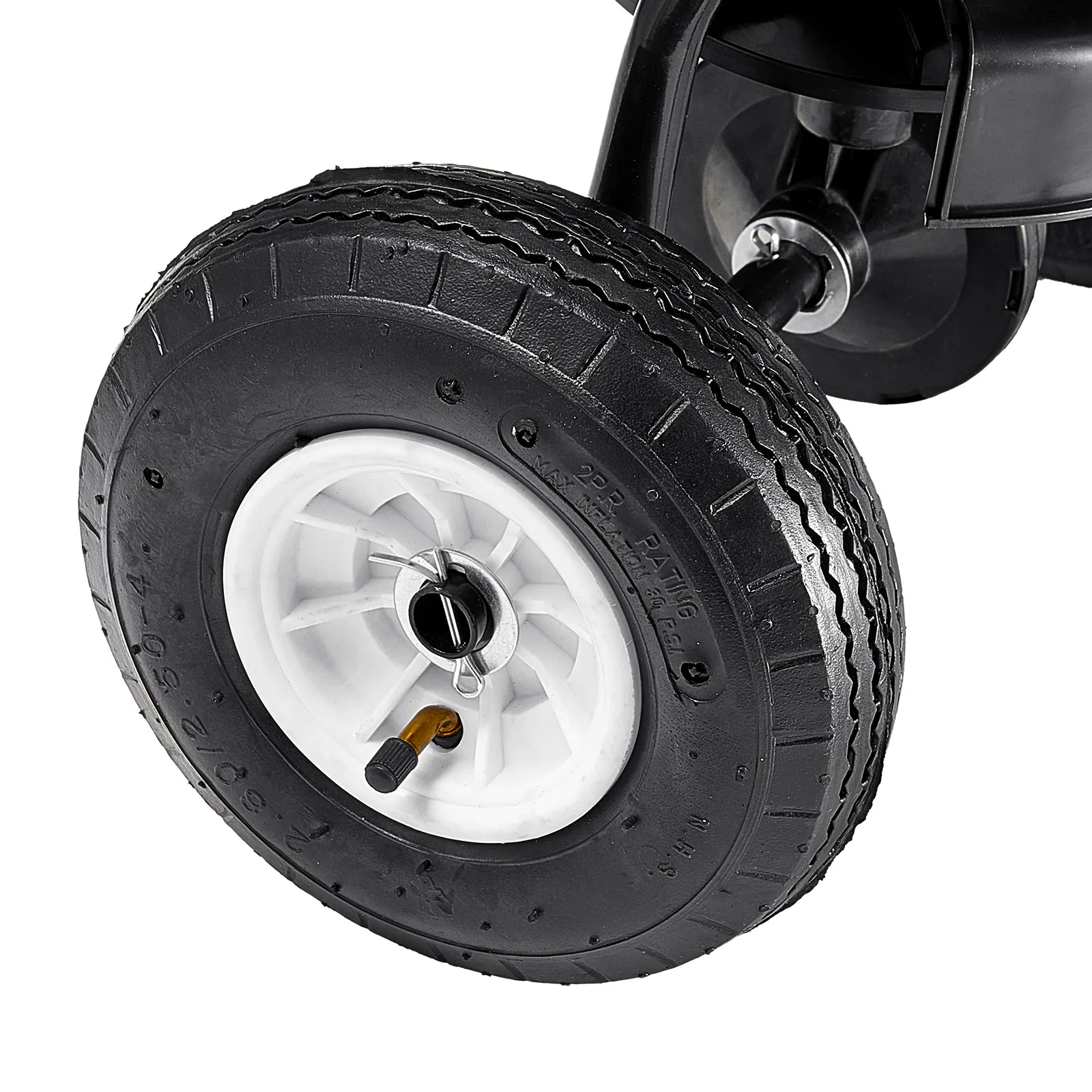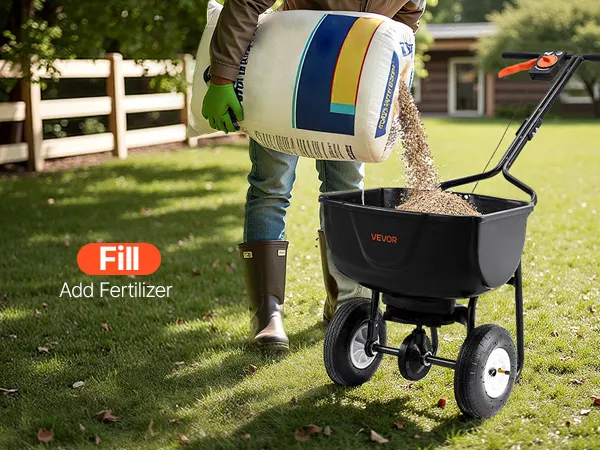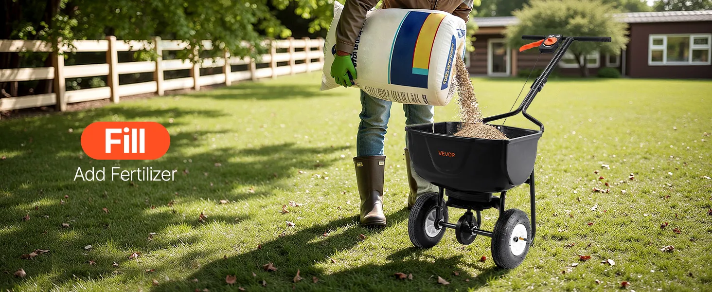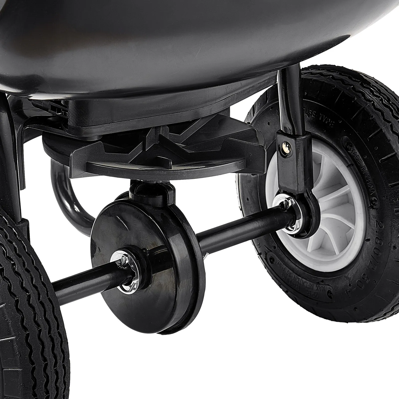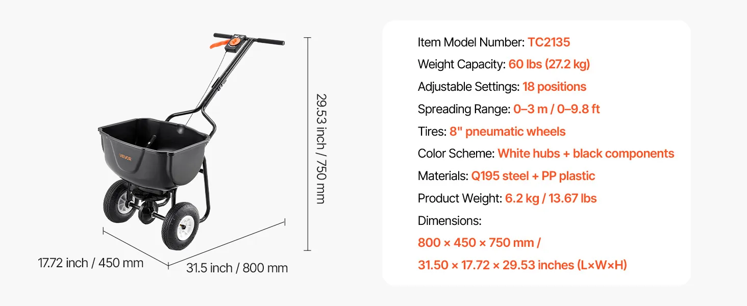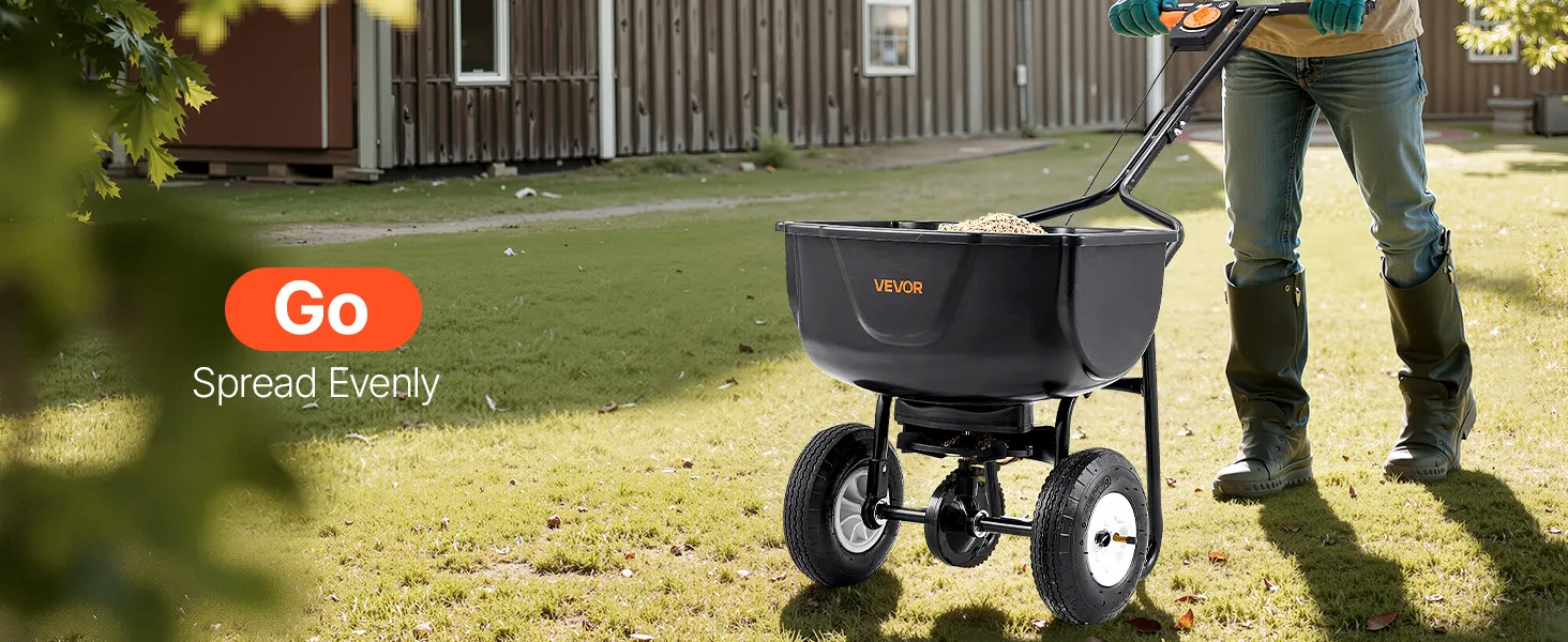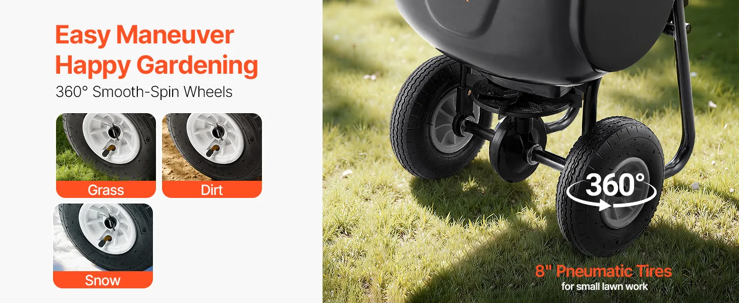Durable Construction: Powder-coated steel frame and explosion-proof plastic hopper, this broadcast spreader resists UV corrosion and impact. Equipped with 8" pneumatic tires for all-terrain use, including grass, gravel, and snow.