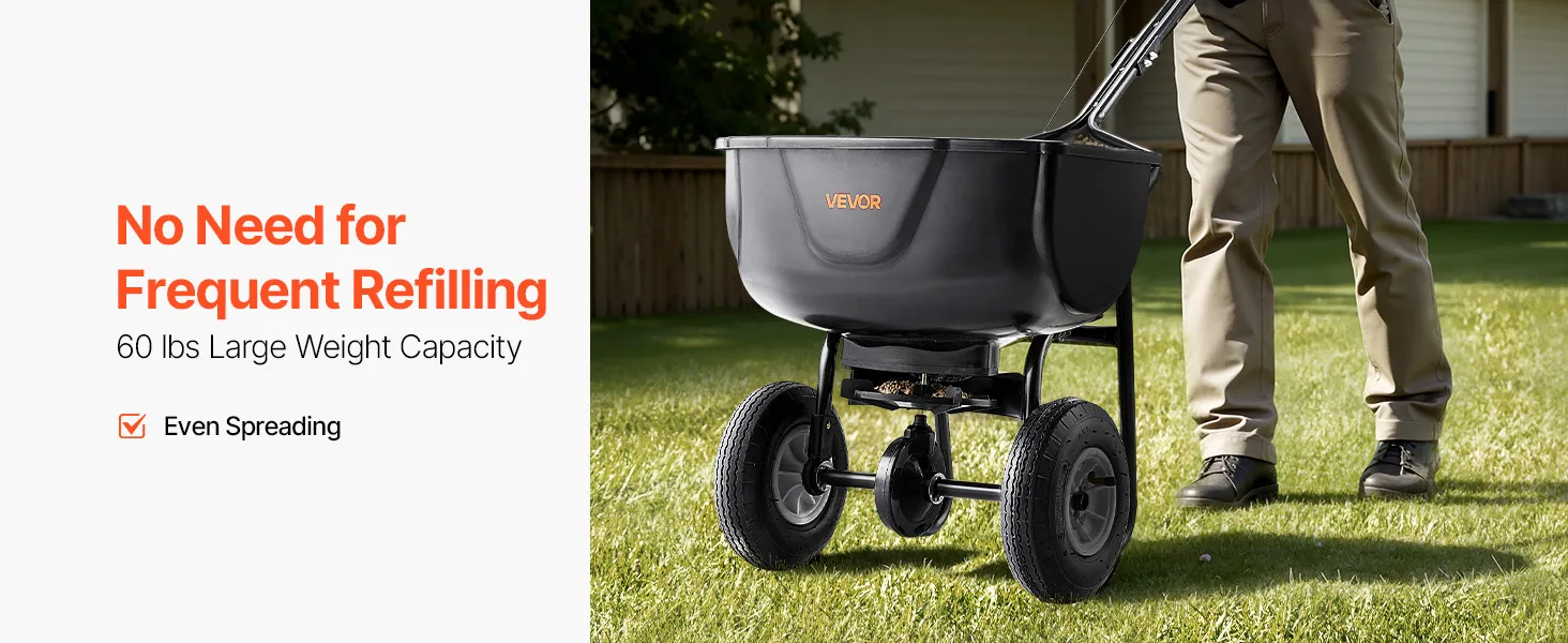 Easy Installation: No tools required for assembly. It is easy for women or seniors to set up the lawn spreader. The 60lb large-capacity hopper reduces refilling frequency, saving time and effort for a more enjoyable gardening experience.