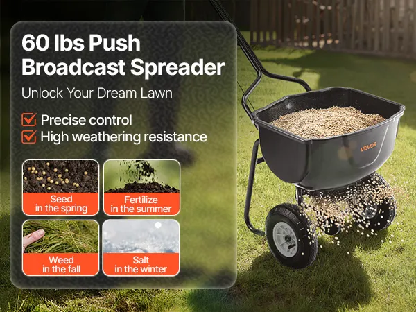 VEVOR Walk Behind Spreader, 60LBS Capacity, Push Spreader with Hopper Grate, 0-9.8 ft Spreading Width, 8 in All Terrain Pneumatic Tires, Garden & Lawn Broadcast Spreaders, for Seed, Fertilizer
