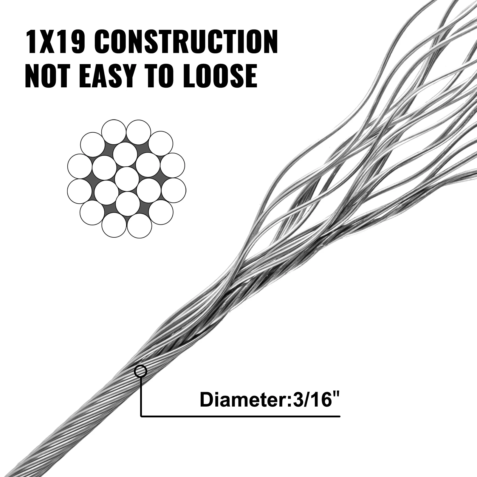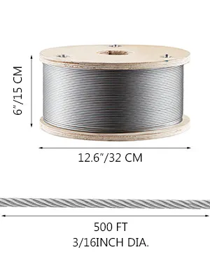 With 4200 lbs/1905 kg breaking strength, 3000 lbs/1306 kg working strength, 3/16''/4.8 mm in diameter, this wire rope is designed to come to long time use.