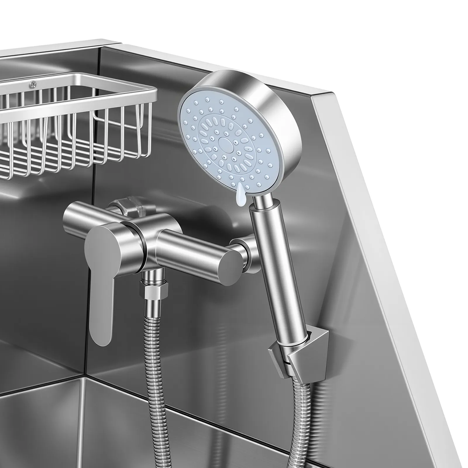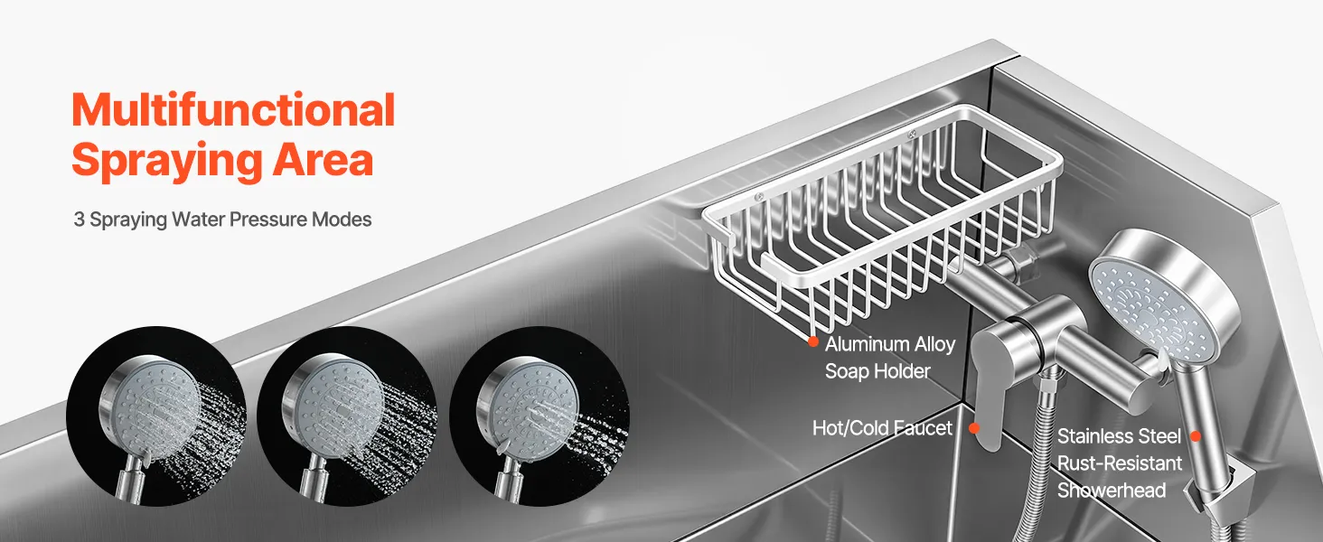 Comfort Bathing: This dog bath station features hot and cold dual-control faucets with three selectable water pressure settings for flexible rinsing. The aluminum alloy soap holder keeps shampoo and grooming tools within easy reach