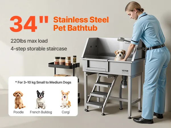 Universal Pet Fit: The pet wash station is for French Bulldogs, Poodles (Teddy), Corgis, Bichon Frises, Miniature Schnauzers, Pugs, West Highland White Terriers, and cats including Exotic Shorthair, Ragdoll, and British Shorthair