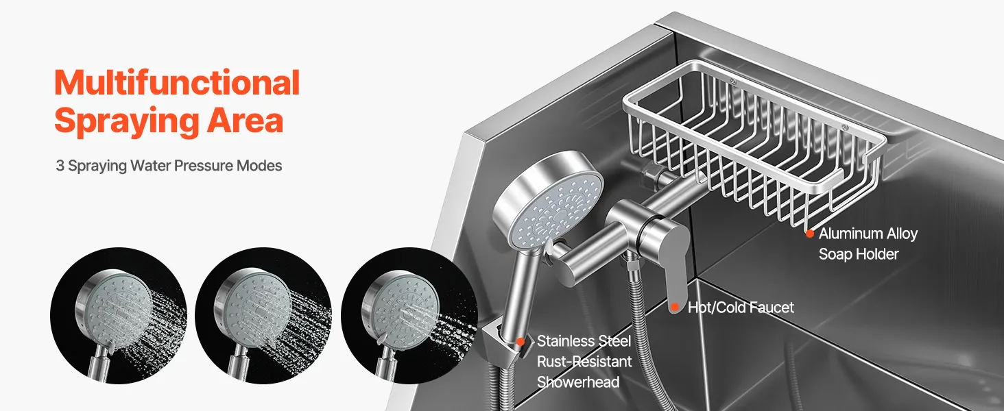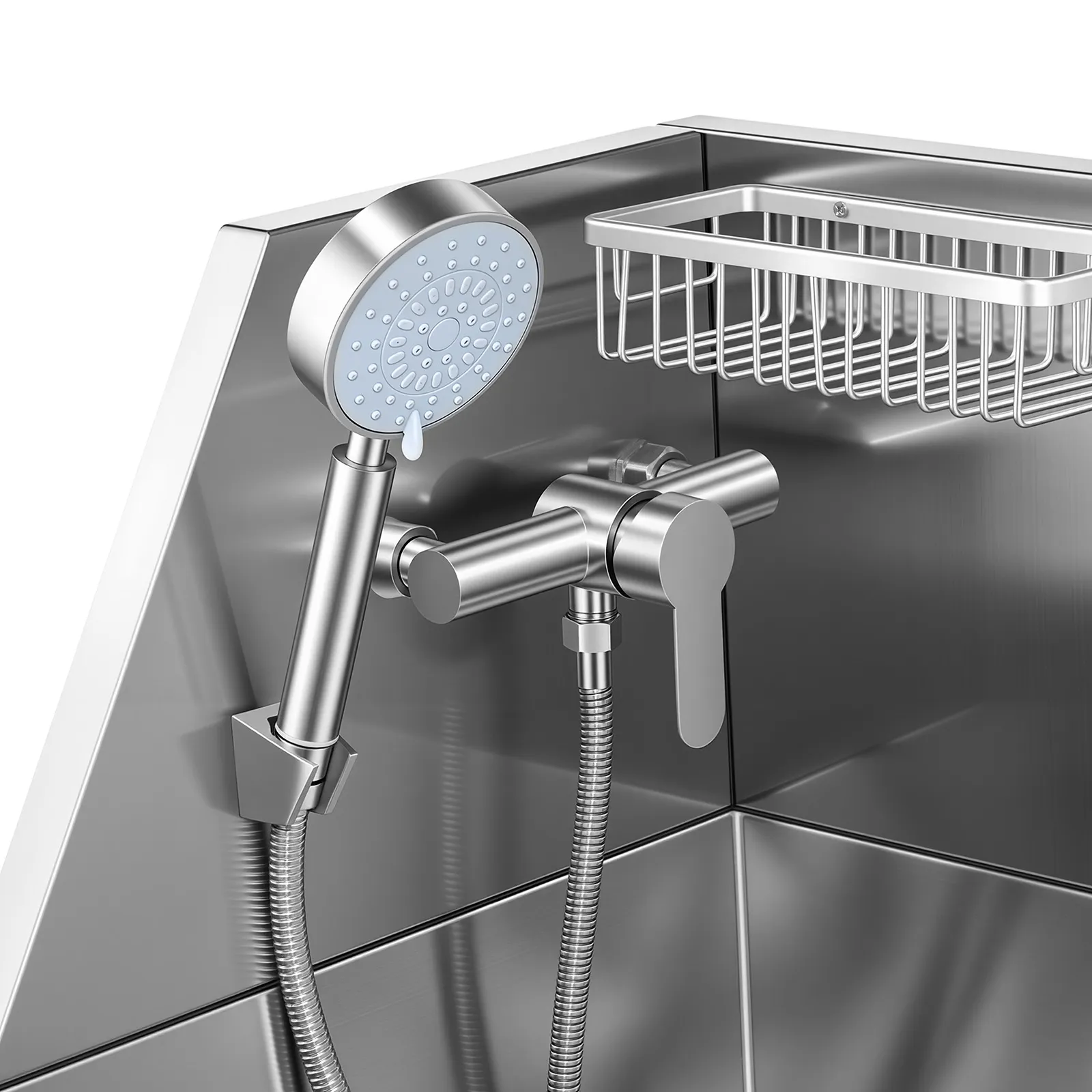 Comfort Bathing: This dog bath station features hot and cold dual-control faucets with three selectable water pressure settings for flexible rinsing. The aluminum alloy soap holder keeps shampoo and grooming tools within easy reach