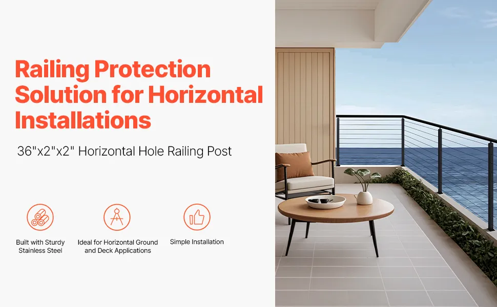 Horizontal Hole Railing Post: This horizontal hole cable railing post is available in 42" and 36" heights, with 0.31" and 0.41" holes, totaling 10-12 holes. It is designed for horizontal ground/deck railing protection, safeguarding you and your family. Note: This product does not include wire ropes