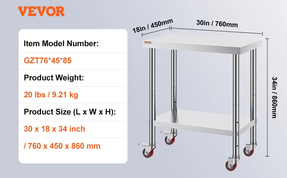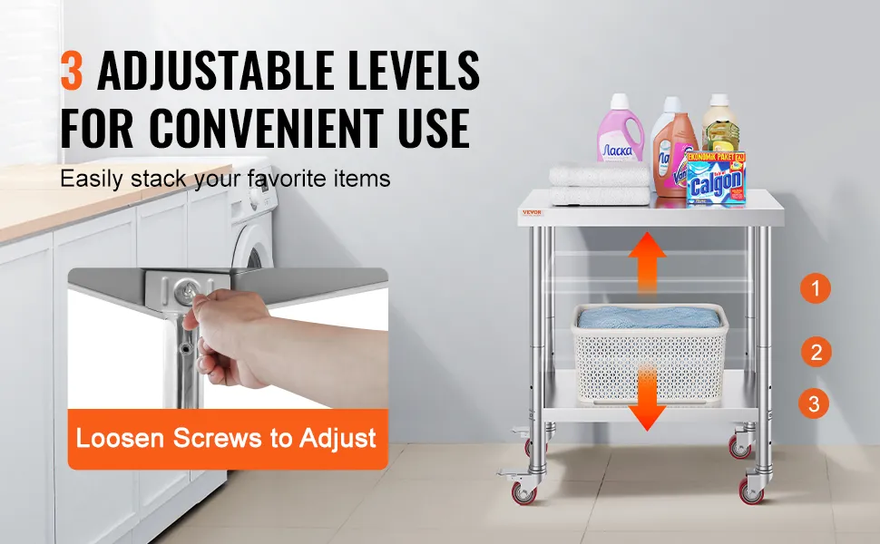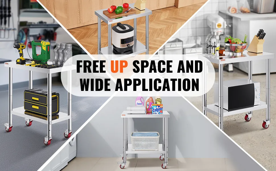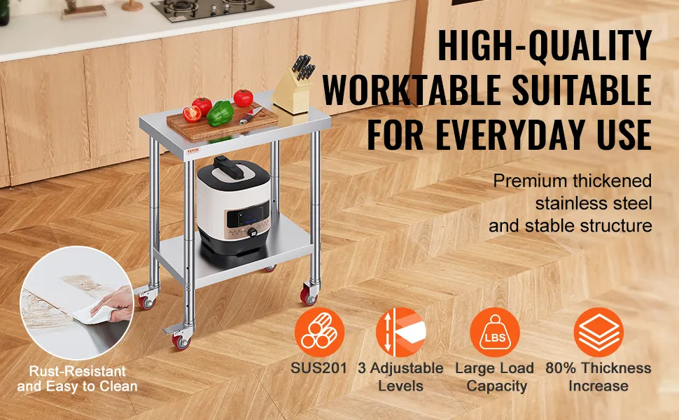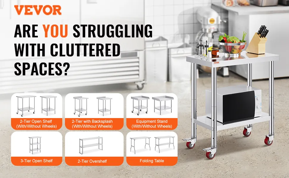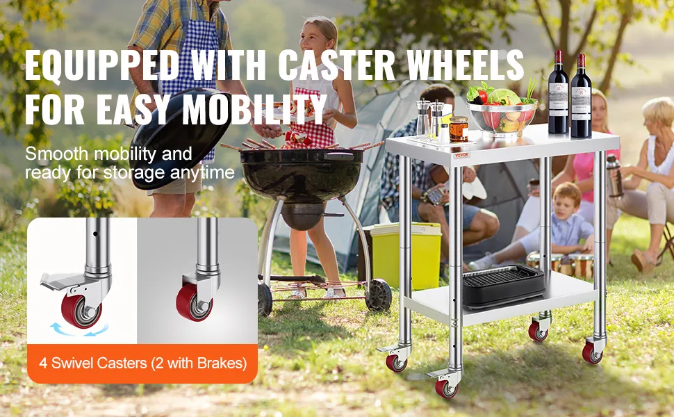 The VEVOR stainless steel work table comes with wheels. These are sturdy and lockable, ensuring stability when you need it. Move your table effortlessly around your kitchen or workspace. Perfect for dynamic kitchen environments where mobility is essential. The wheel makes it easy to clean around and under the table. Shift the stainless steel work table to different areas of your cooking or restaurant as needed. Double-locking keeps the tables secure when stationary. Simplifies your workflow by providing mobile workspace solutions. Easy to position based on your cooking or preparation needs. An excellent solution for kitchens with changing layouts or limited space.