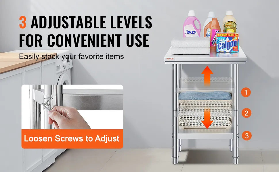 The table features an adjustable lower shelf. It allows for customized storage options. You can set the shelf to different heights to suit your needs. This flexibility is ideal for storing various items. The adjustable height makes it versatile for various tasks. For instance, you can easily store pots, pans, and other kitchen tools. The lower shelf adds extra storage without taking up extra space, making the table even more useful in busy kitchens. The adjustable height ensures that the table fits your specific needs perfectly.