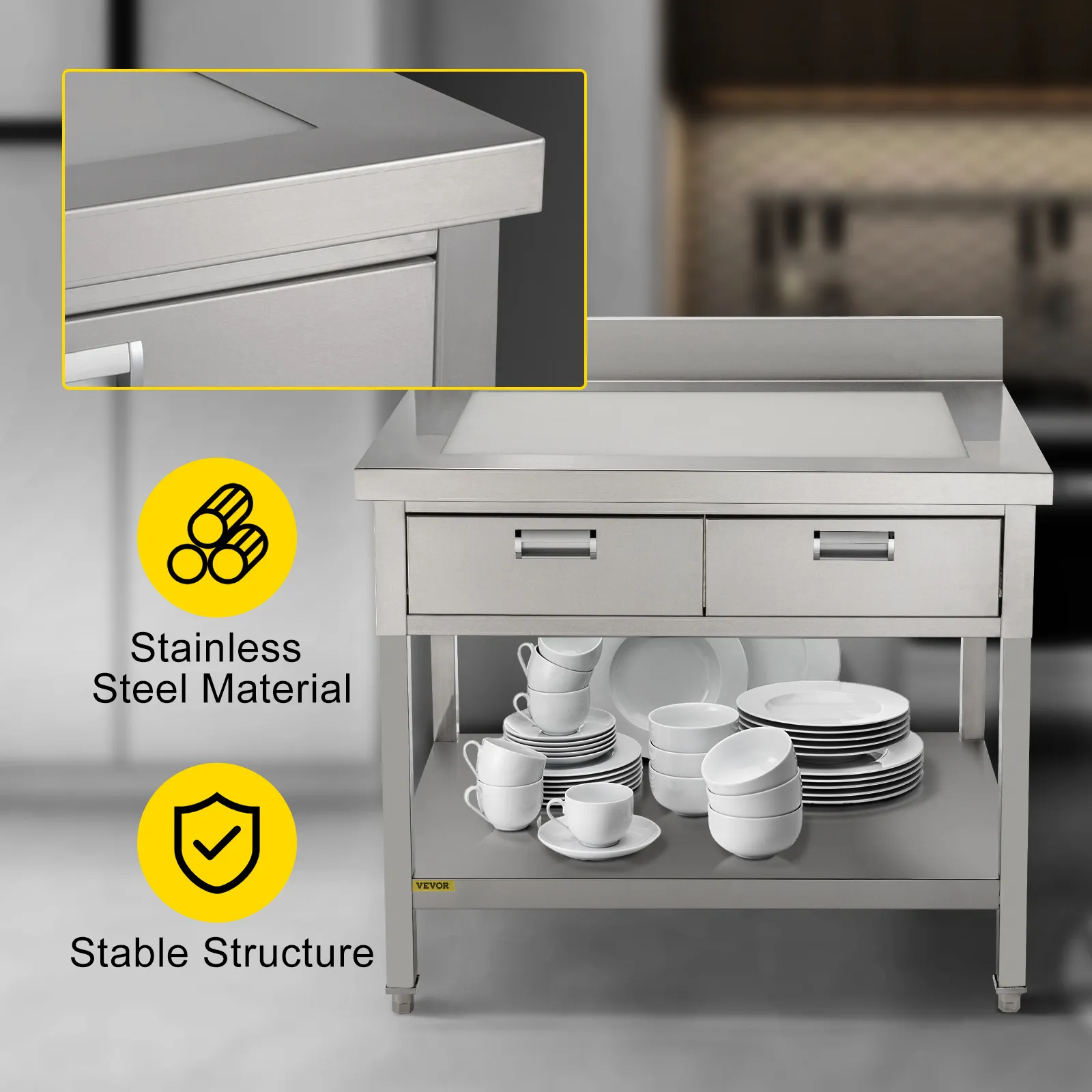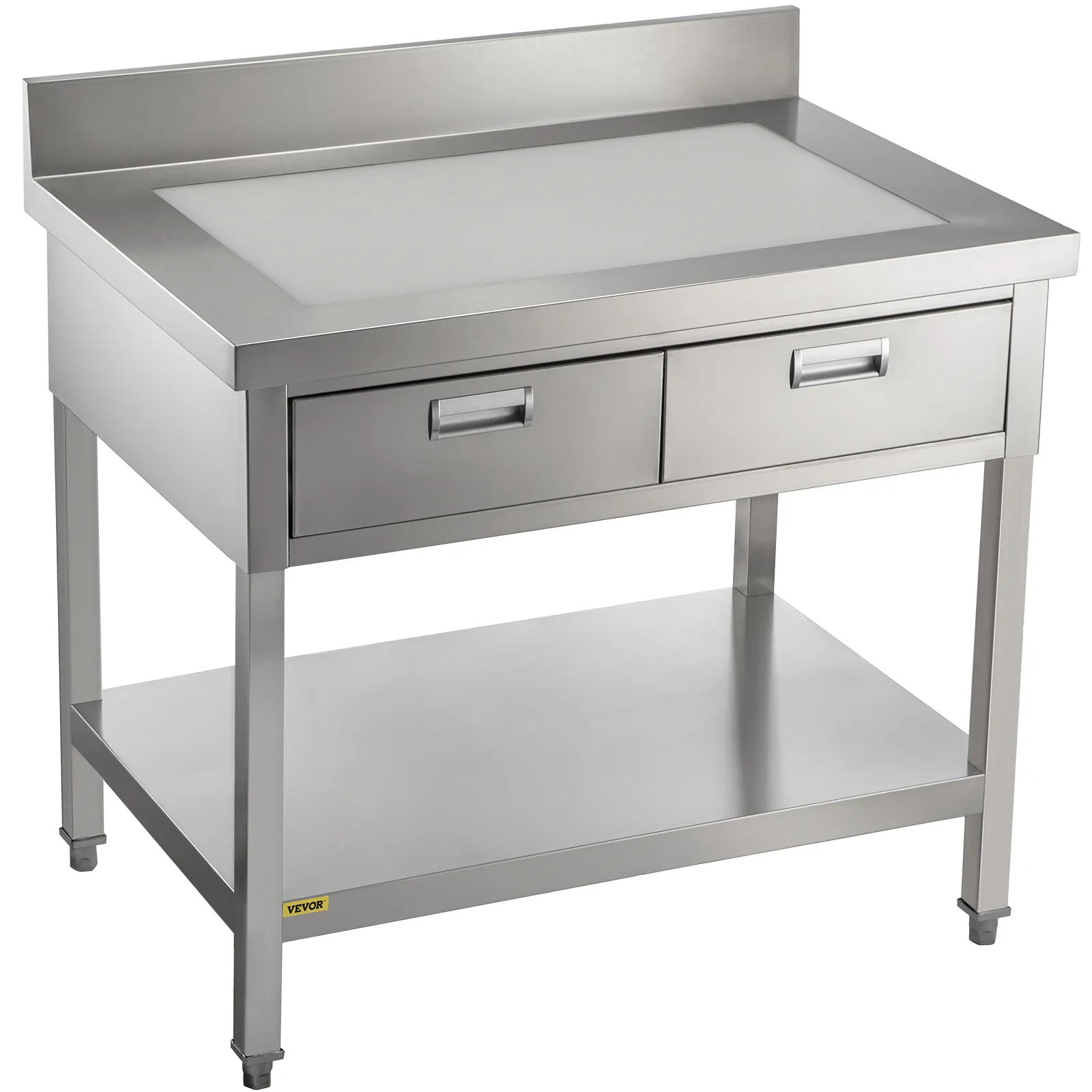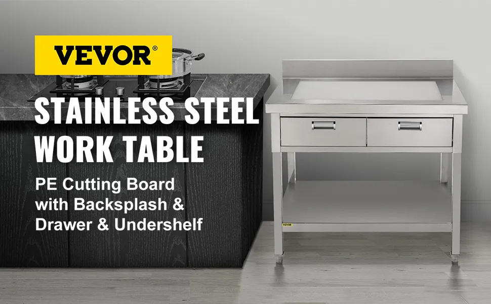 No matter what type of food service establishment you operate, it's important to outfit your kitchen with commercial work tables so that you can prepare entrees, sides, and desserts. The stainless steel prep table in VEVOR is of the premium material and sturdy structure. Equipped with the PE material tabletop, you can not only store kitchen things but also use it to chop vegetables, knead the dough and cut meat.