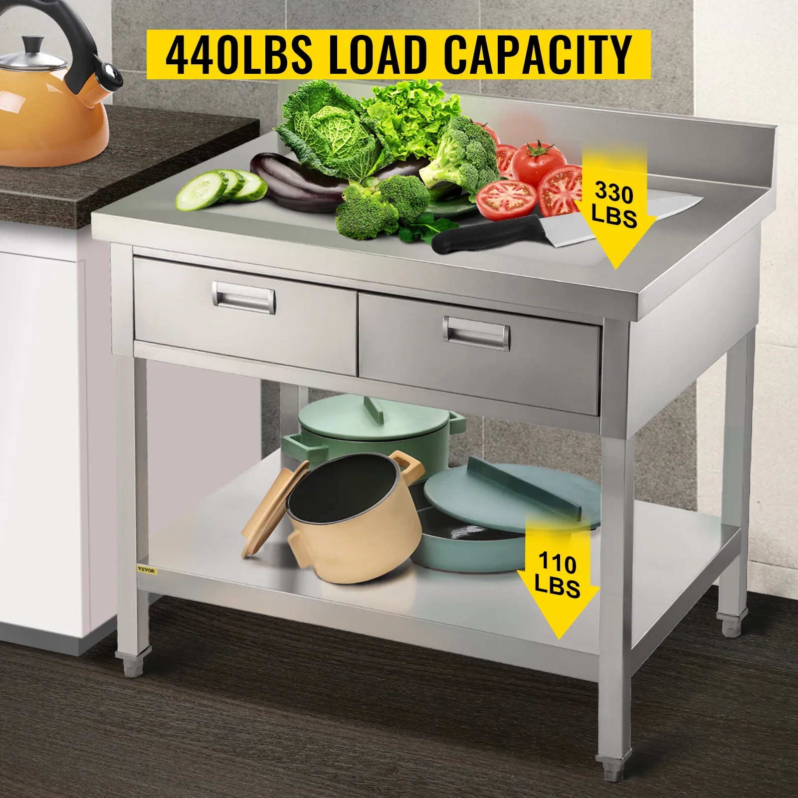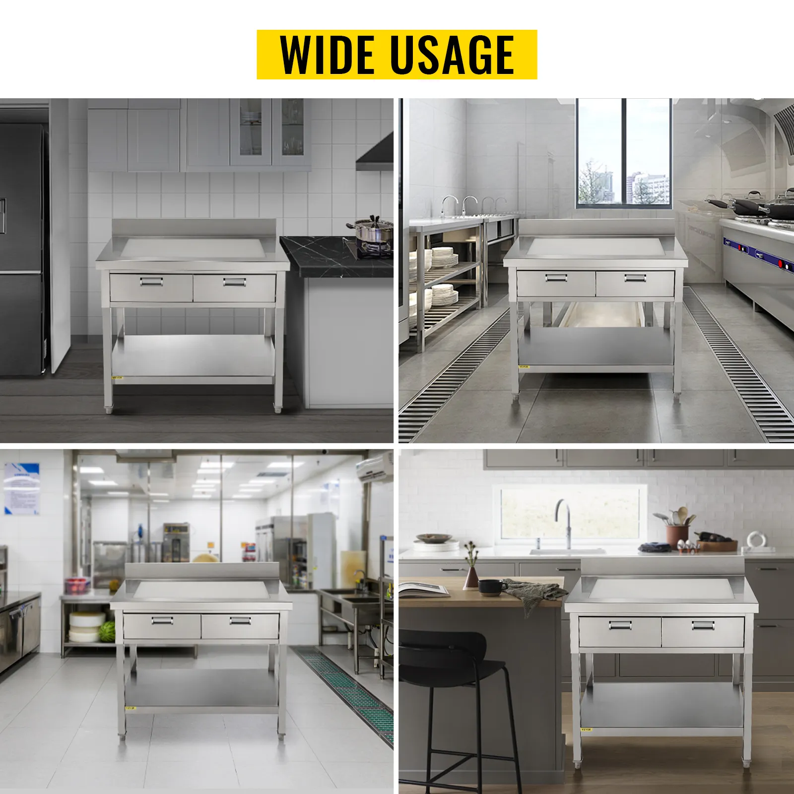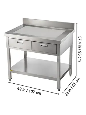 Rock Solid Material: The heavy-duty stainless steel material contributes to the kitchen prep table's durability and utility, featuring a brushed finish. It is effortless to clean. At the same time, the table legs are 3.8 x 3.8 cm, sturdy enough to hold heavy objects, won't shake during use.