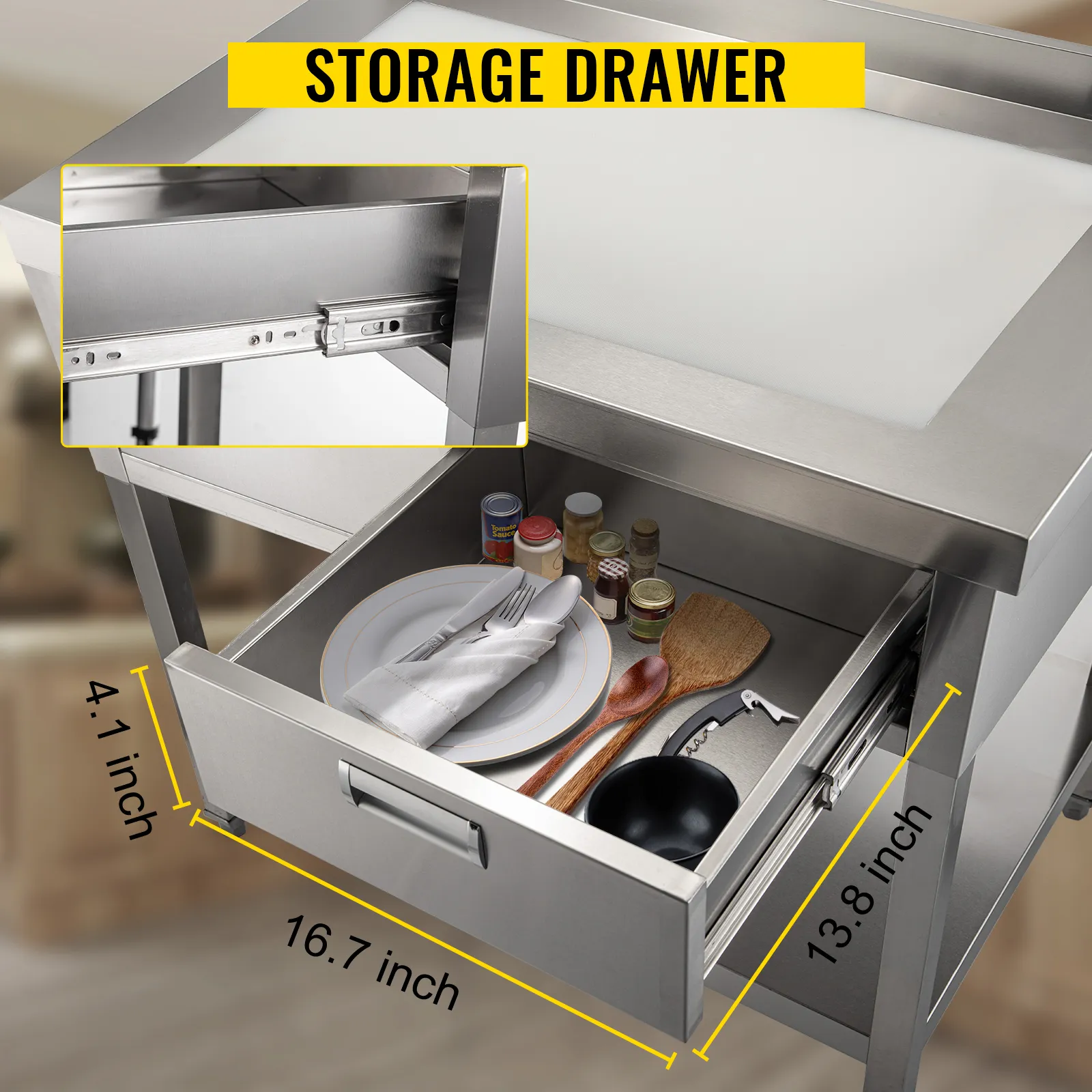 Extra Storage Drawer: Drawer Dimension: 16.7 x 13.8 x 4.1 inch. Designed with one large drawer for extra storage space; This butcher table features smooth sliding rails mounted on both sides. You can smoothly open and close the drawers with no noise. The sleek and ergonomic handle can give you a comfortable hand feeling.