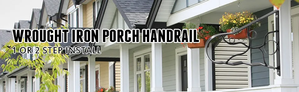 This porch railing is designed to provide a grab bar when people up or down porch stairs. Wrought iron material, powder-coated surface, and offers a vintage look that matches your house. Quick to install, and included all devices.