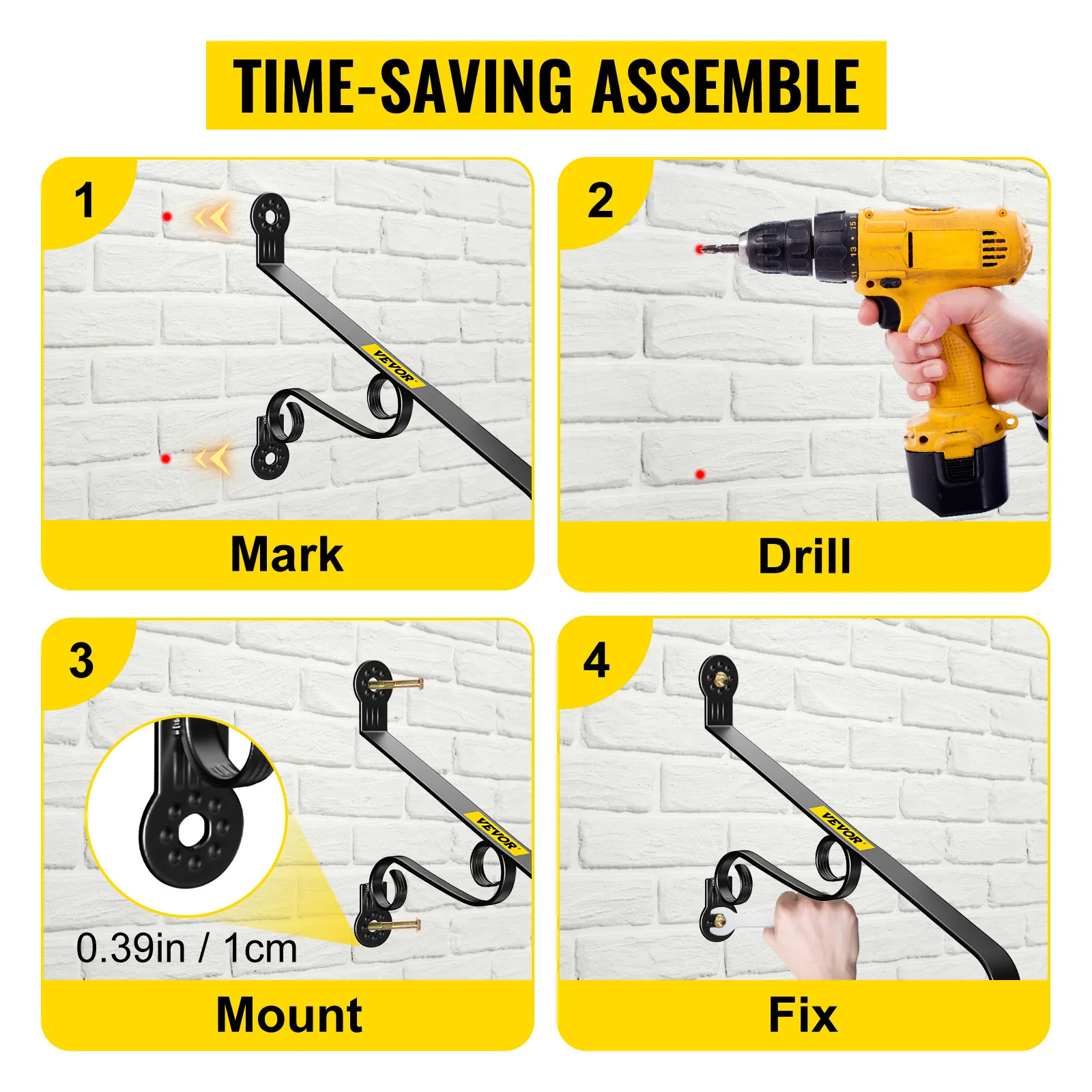 Installation Kit to Assemble: With all needed accessories, the stair railing kit is effortless to assemble by one person in a few minutes. Marking the desired position on the wall, then drilling holes with drill bit(not included), comes the next is to put expansion screws and fix them with the wrench.