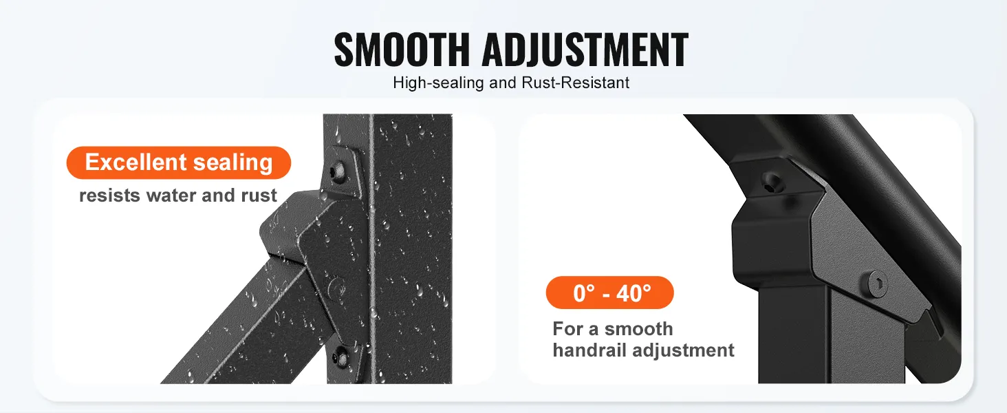 Crafted from premium materials, our handrails feature highly sealed connectors that is rustproof even in outdoor rain conditions. The smooth angle adjustment ensures versatility for various settings.