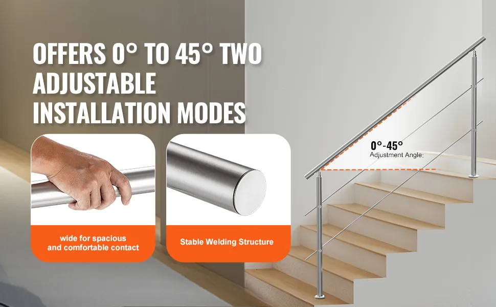 0°-45° Adjustable Angle: The handrail features an adjustable range from 0 to 45 degrees, making it ideal for most doorsteps, garage entrances, garden railings, and more. This flexibility allows it to accommodate various stair configurations effectively.
