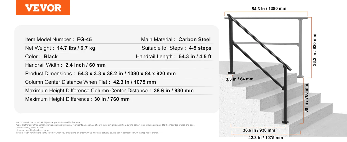 220 lbs Robust Load Capacity: This stair handrail is built to last, offering reliable safety for both elderly individuals and children. The thickened grip ensures comfort and security, making it easy for everyone, including pregnant women and the elderly, to use confidently. IMPORTANT TIPS:Before purchasing, please measure the maximum center distance and height difference of your stairs to ensure they match the handrail dimensions. Otherwise, the handrail may not be installable!!!!!!