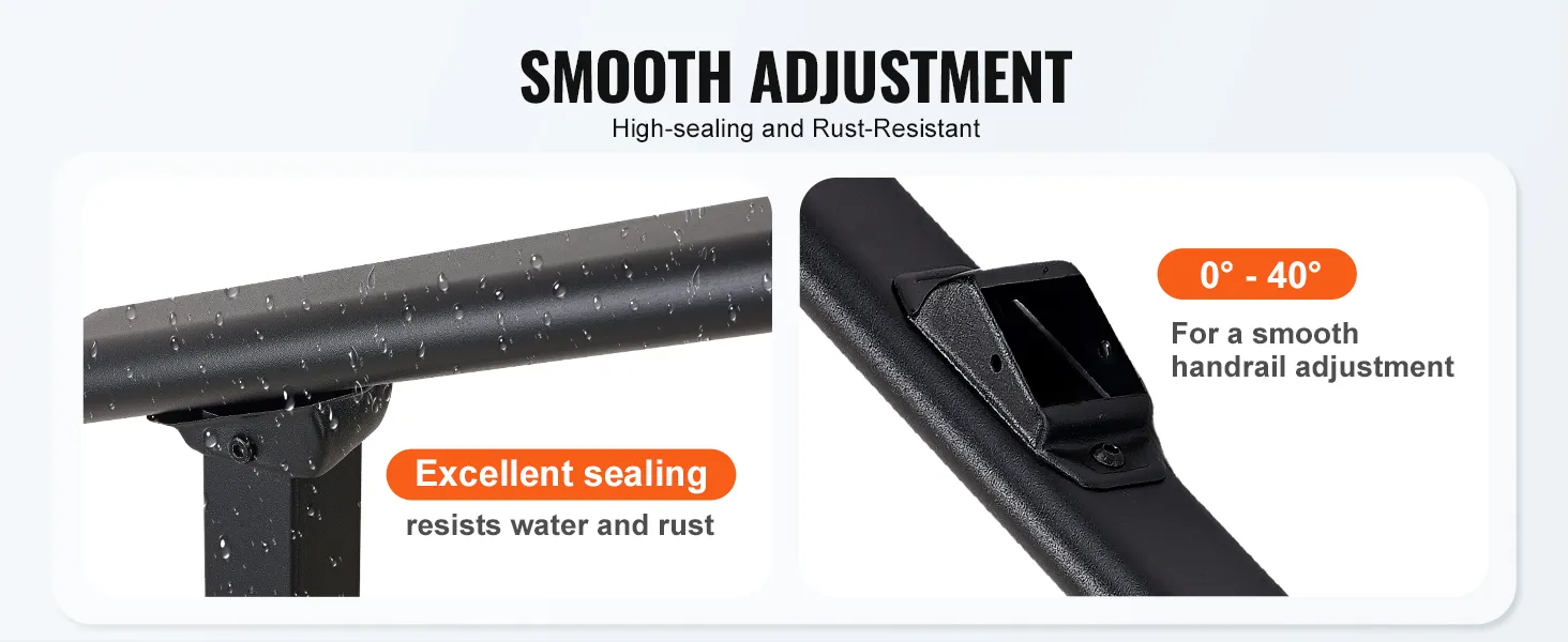 Crafted from premium materials, our handrails feature highly sealed connectors that is rustproof even in outdoor rain conditions. The smooth angle adjustment ensures versatility for various settings.