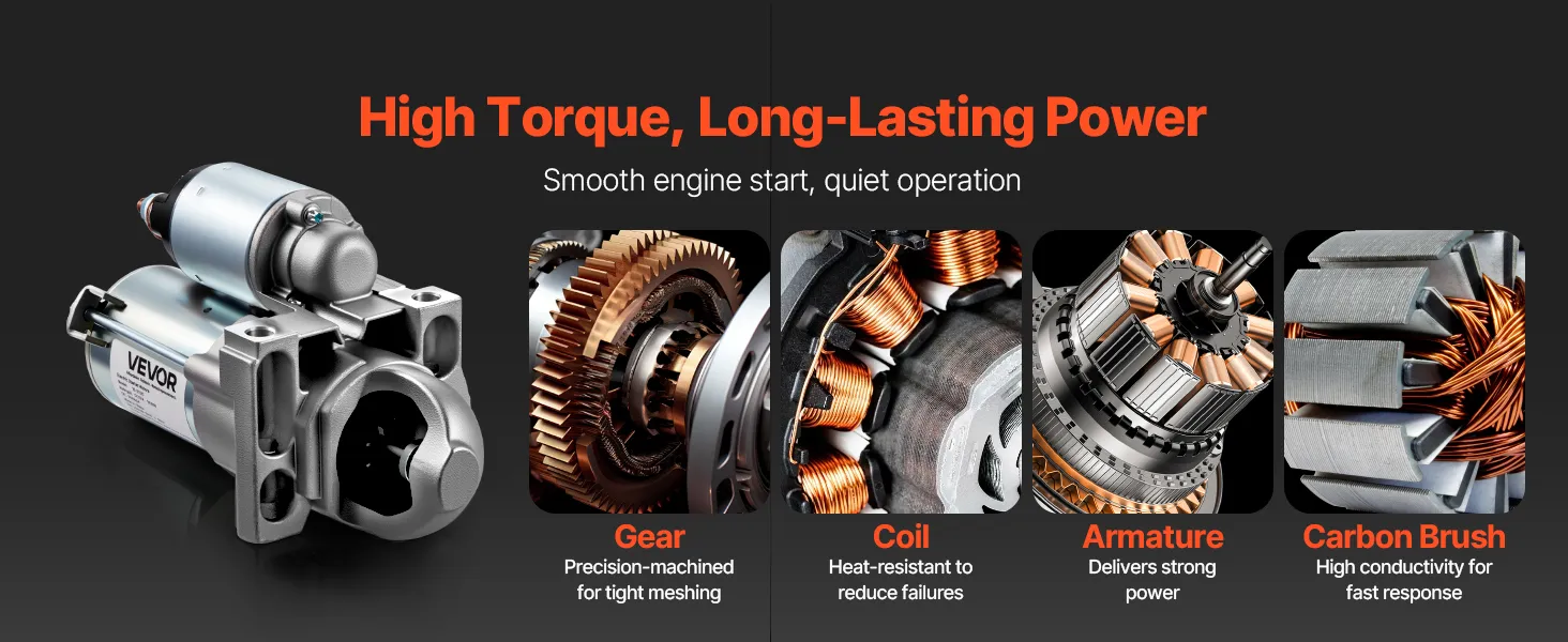 Powerful Performance: The starter replacement features the high-torque armature, high-conductivity carbon brush, and high-temp coil for durability. When energized, it works with the solenoid to deliver strong power, ensuring the engine starts quickly